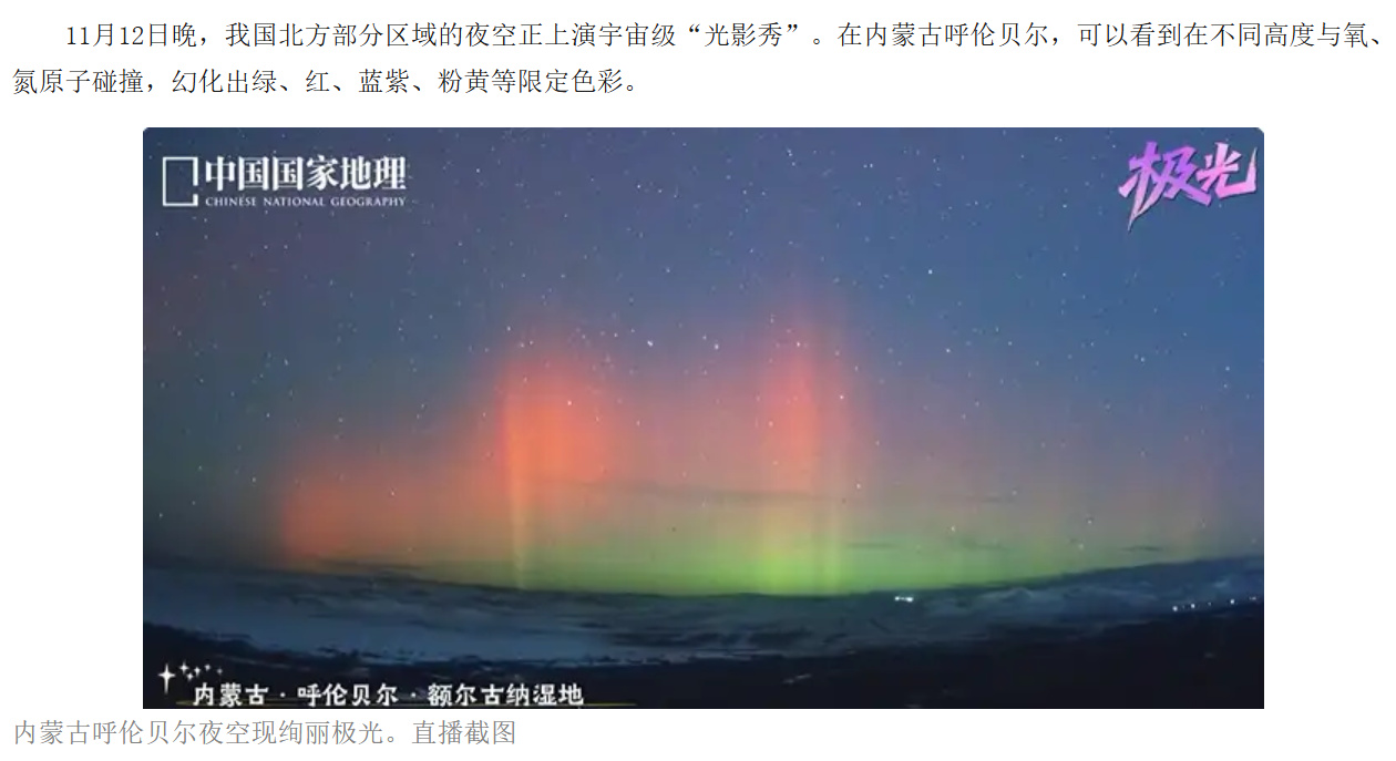 11月12日晚,我国北方部分区域的夜空正上演宇宙级“光影秀”。在内蒙古呼伦贝尔,可以看到在不同高度与氧、氮原子碰撞,幻化出绿、红、蓝紫、粉黄等限定色彩。