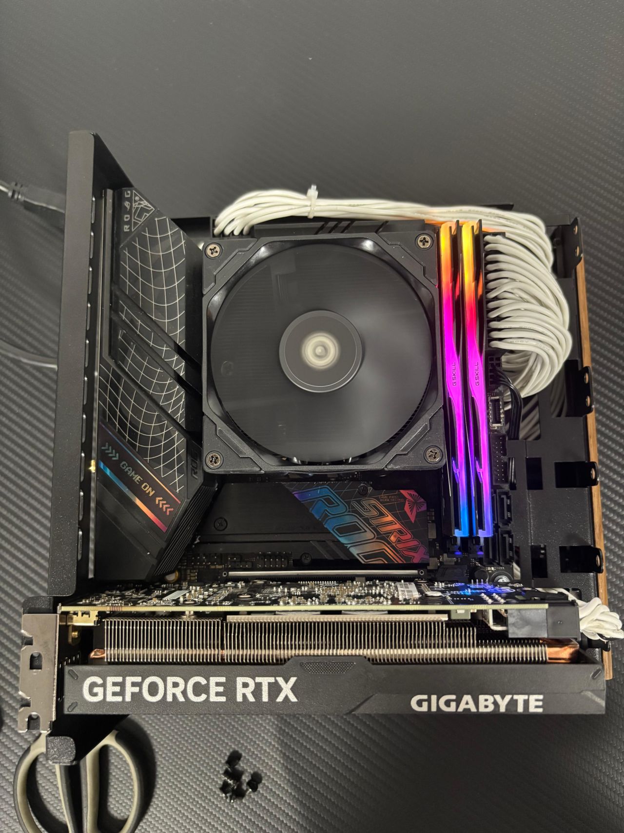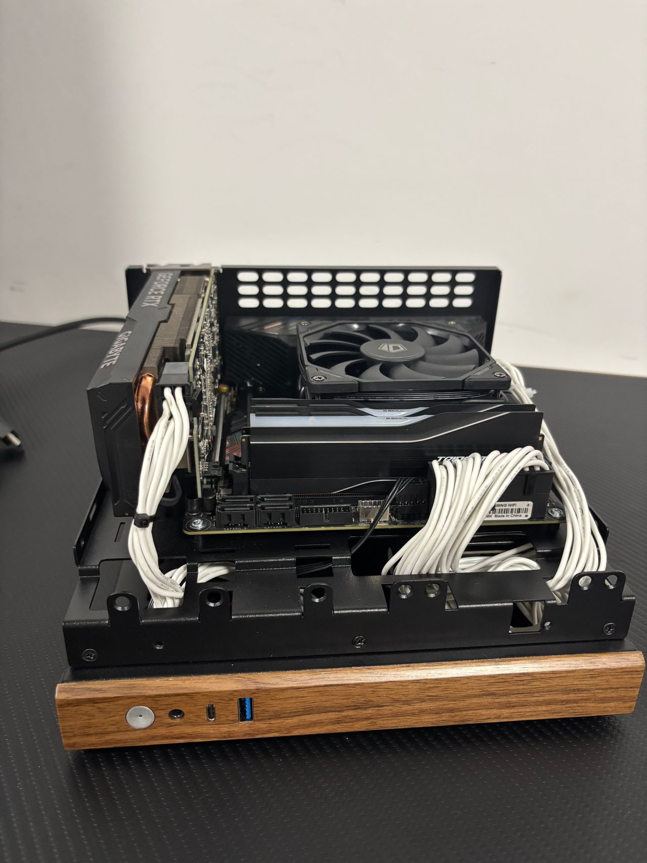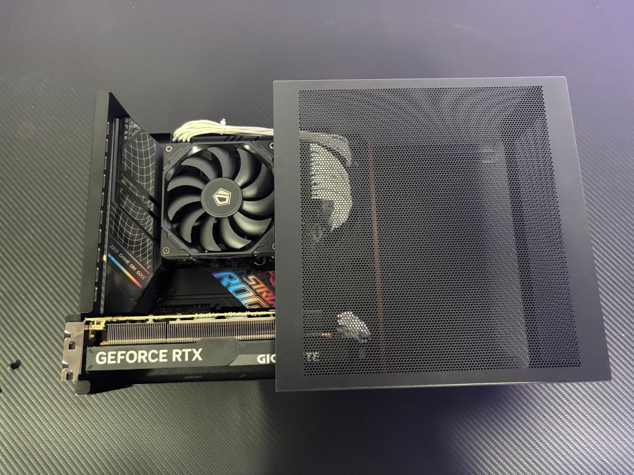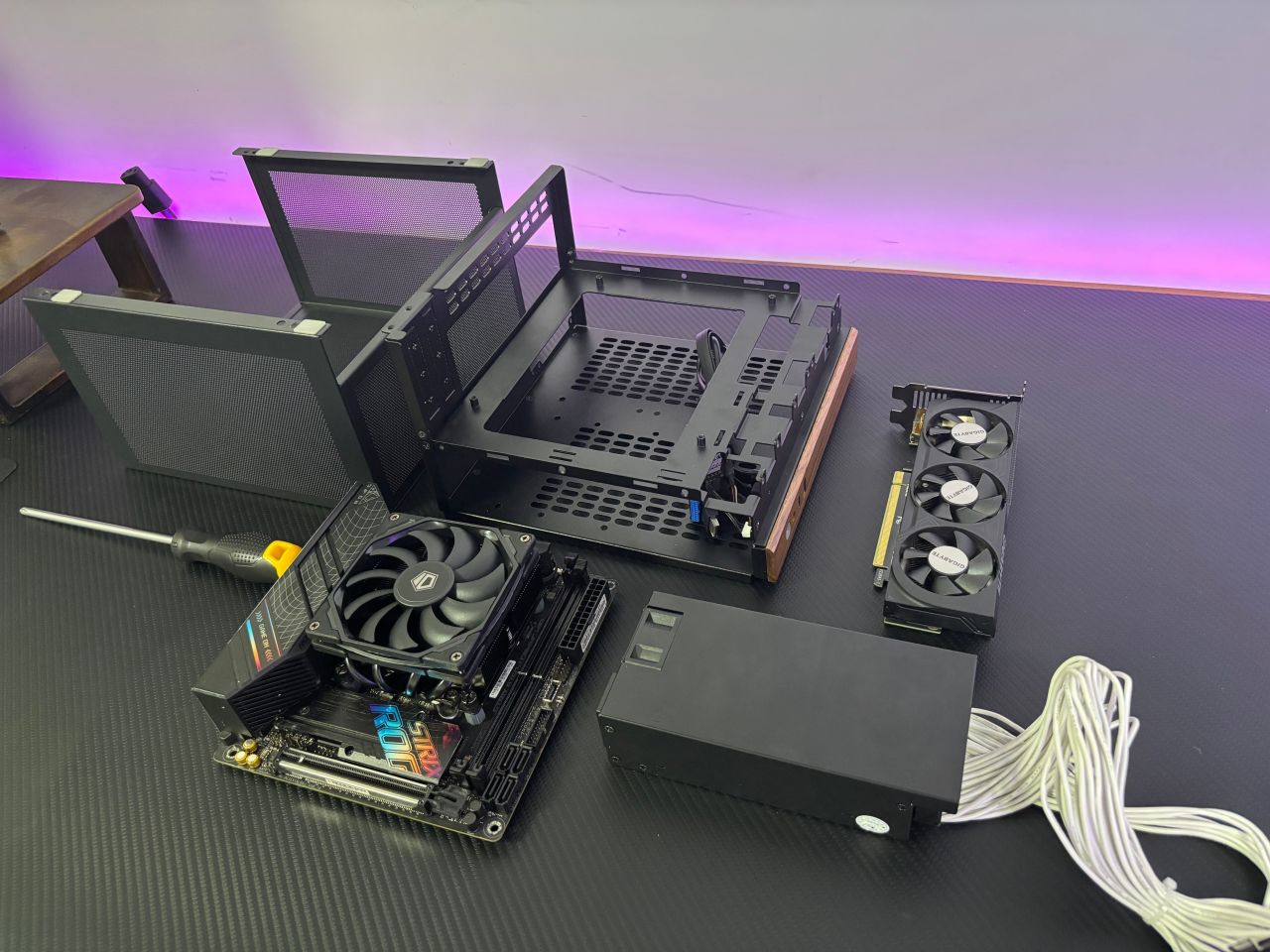 机子弄出来肯定是先测试一下装机难度,为了尽可能减少ITX对新手们的装机难度,这次弄成了相当于半开放式的机箱,外壳只需要在装好所有硬件后,像抽屉一样滑进去即可,难度就直接变成了和常规大机箱一样容易安装