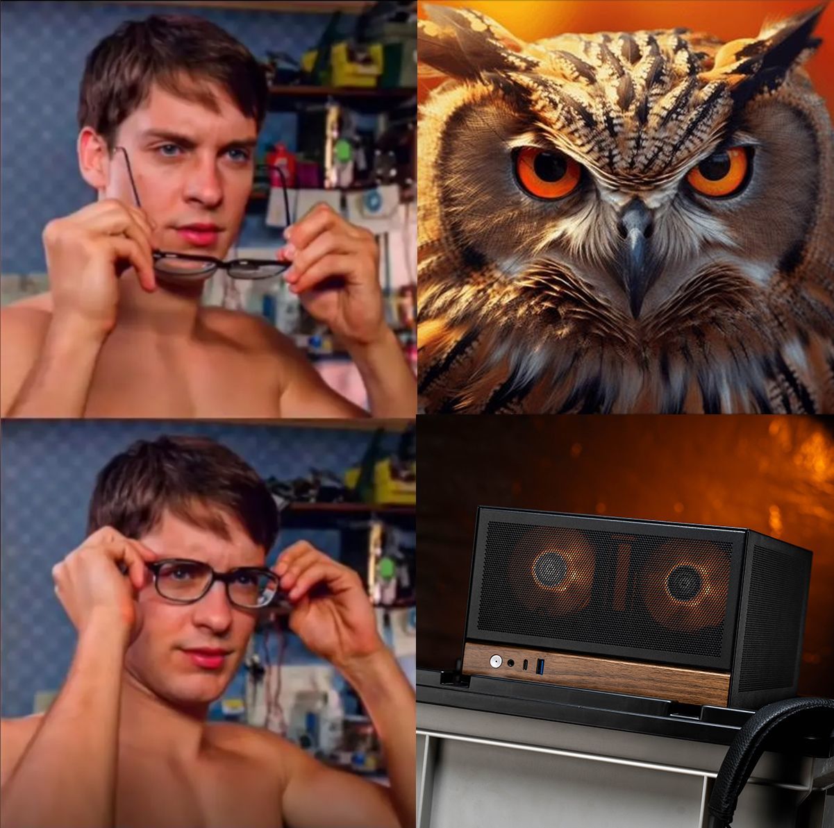 而风扇的兼容就如图片这样,前进风口两个9cm的小风扇,装好风扇后第一眼过去,跟猫头鹰的眼睛居然还有几分相似