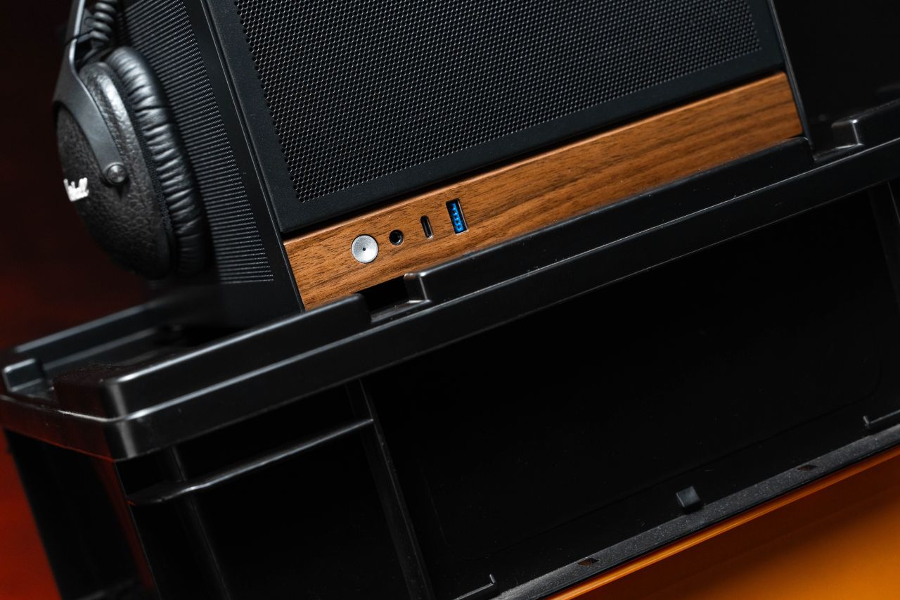最后再给大家准备几张精修图片看看外型,外壳每一面均为通风网孔,开关模组处采用了木质装饰,机箱框架和外壳均为SPCC钢材