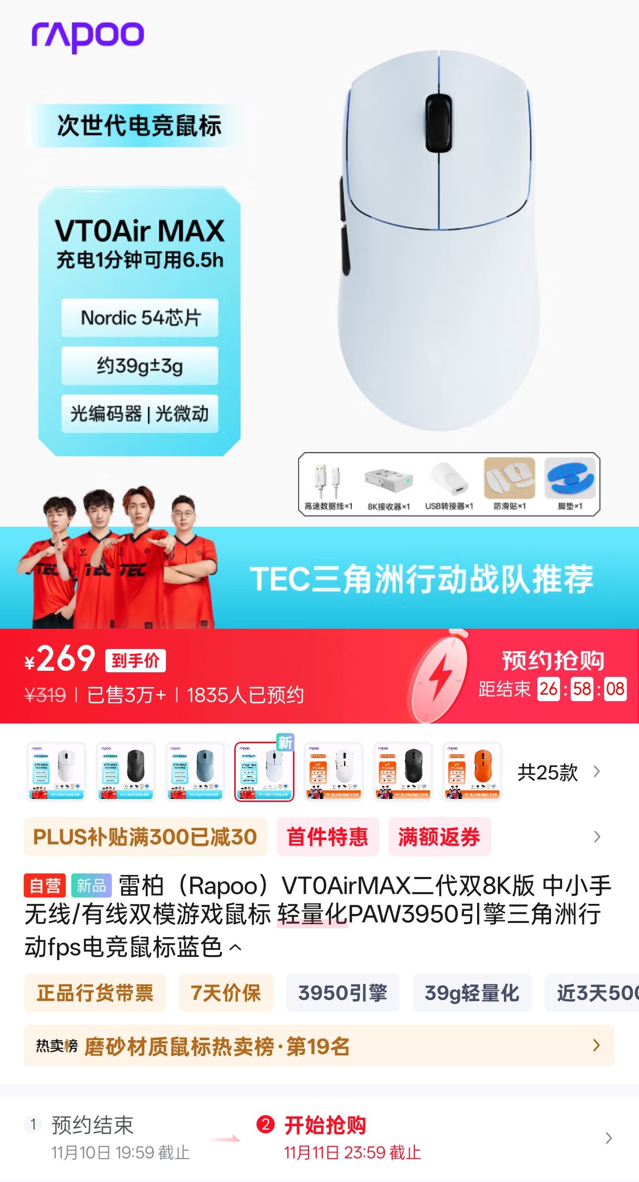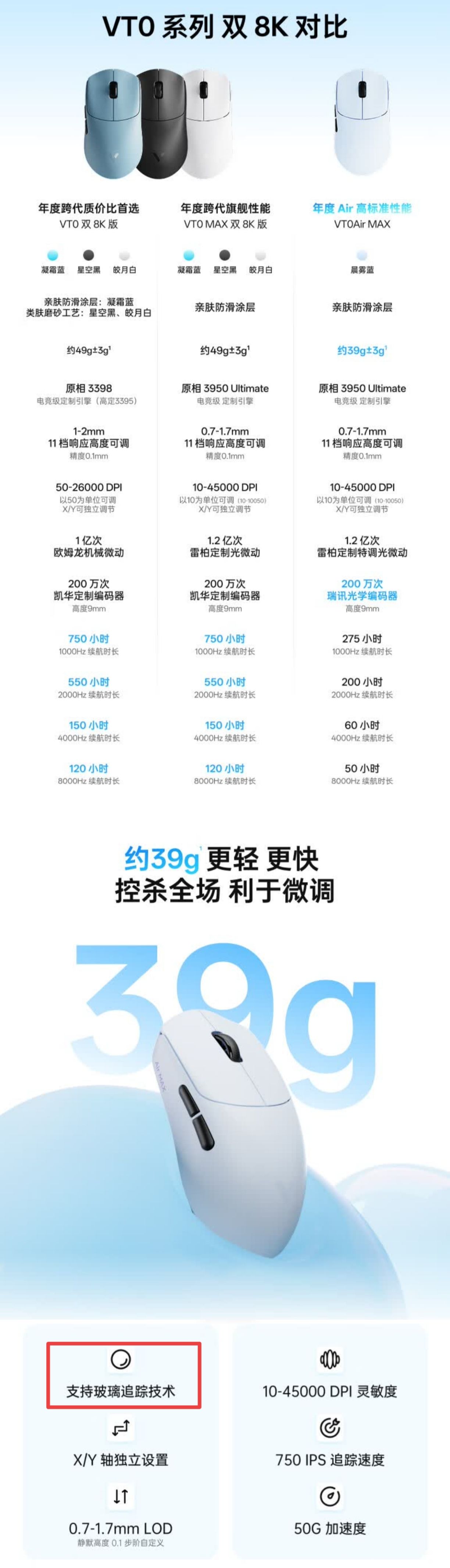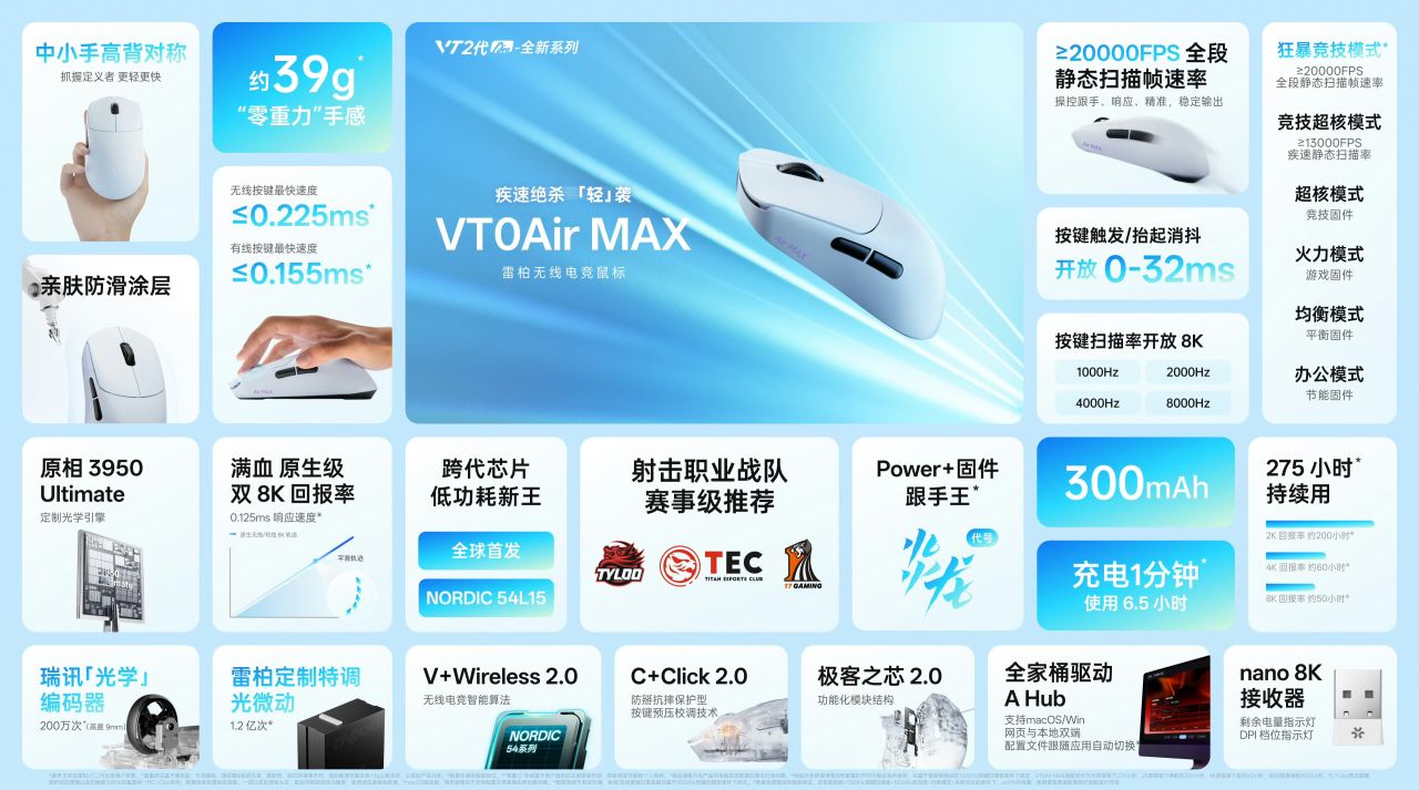 11月10日晚8点,雷柏VT0Air MAX正式于京东自营店开售,首发319元,PLUS会员叠券到手价269,目前仅一个晨雾蓝配色上架。定位中小手抓握,兼容中手指握,对称设计。重量控制在39g±3g。