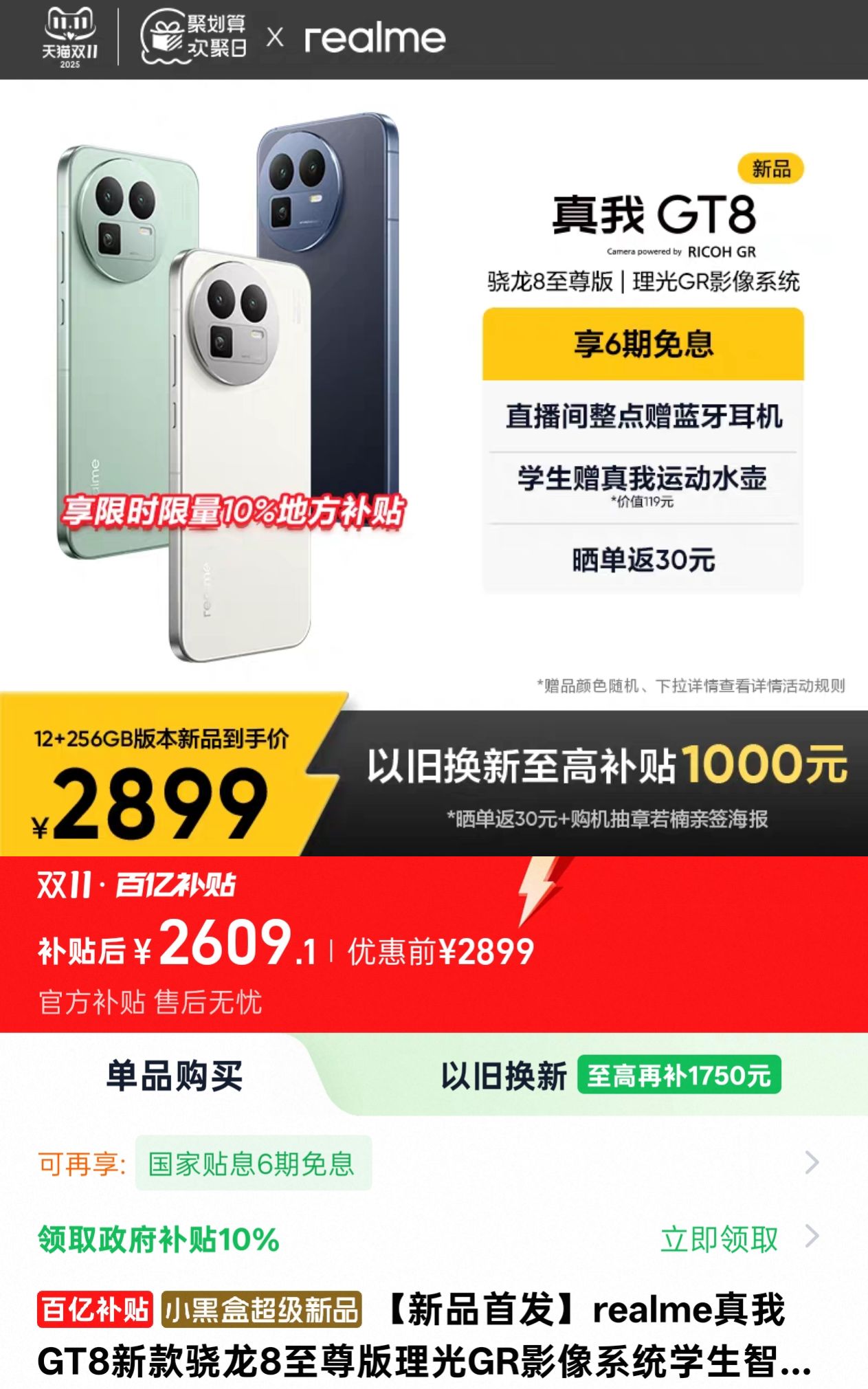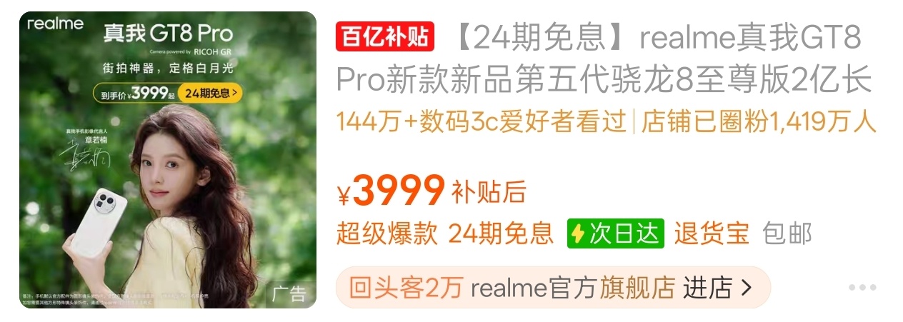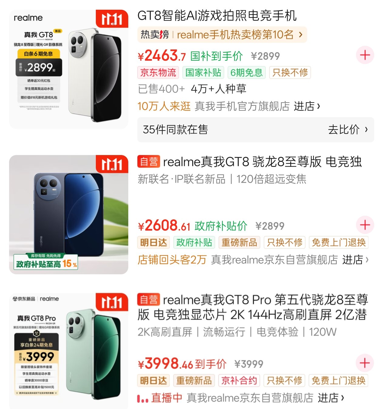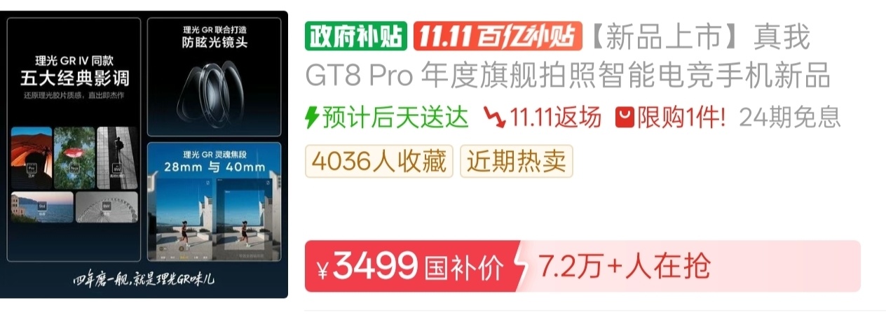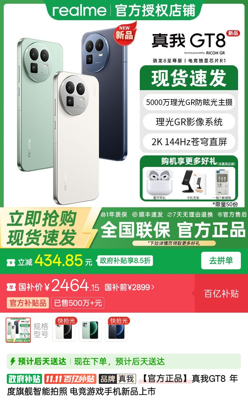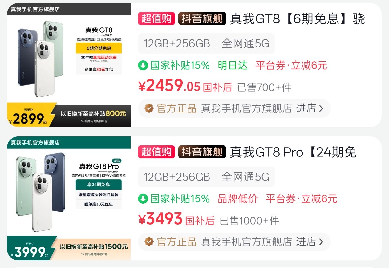 下半年各家的新机又按照以往惯例,把价格抬向了新高度,双11手机的优惠也不大,但有些牌子跳水是真快啊!从11月5日(距离发布时间才过去了两周)开始,拼多多百亿补贴就出现了分别政补434和政补500元的真我GT8、GT8Pro。抖音商城力度与拼多多相同。又瞅了眼京东,官方自营只给GT8政补了200多,非自营的官方旗舰店则跟拼多多的力度差不多;淘宝的官方旗舰店,GT8补了200多,而GT8Pro倒是和京东一样,什么都没有