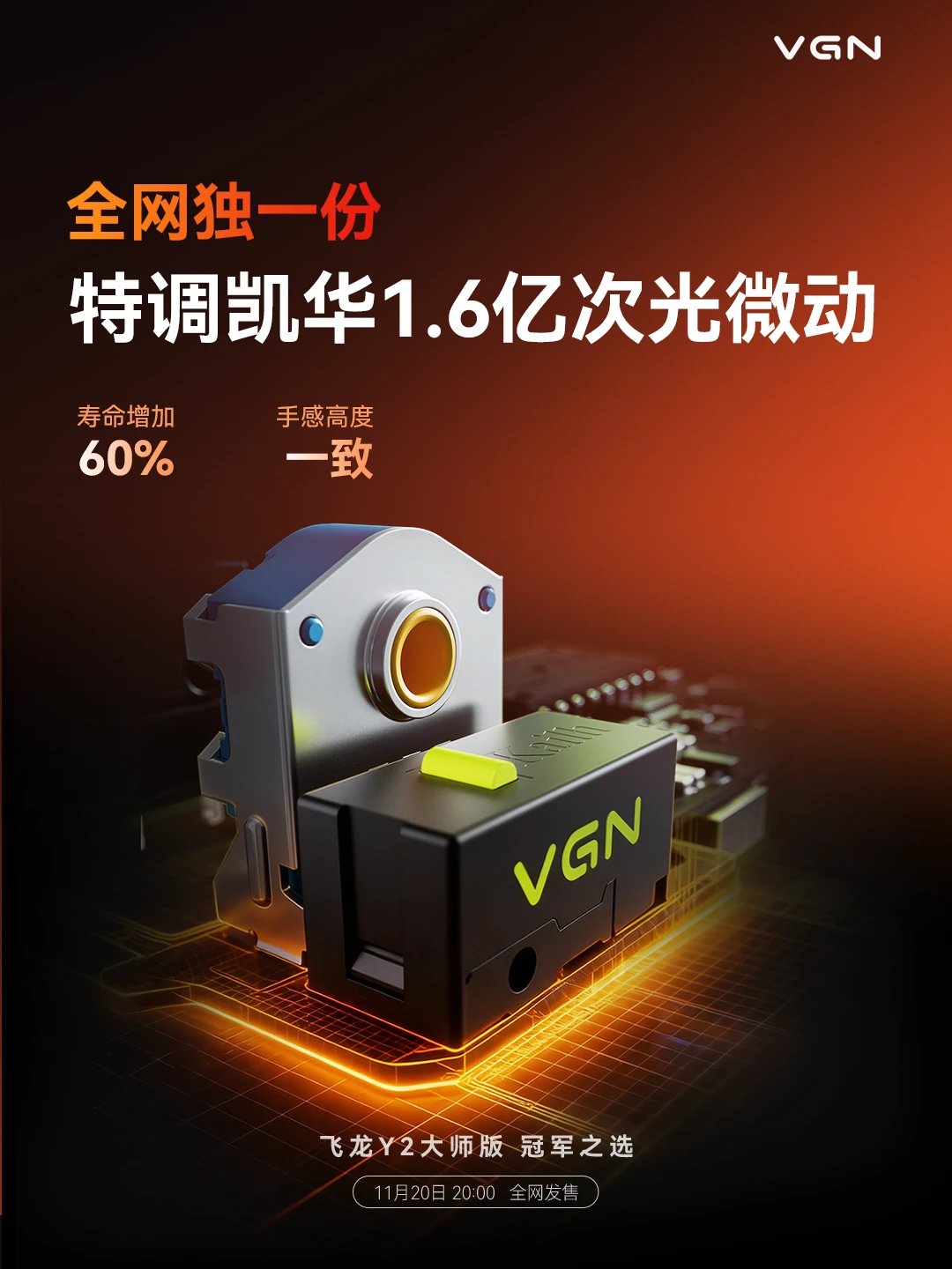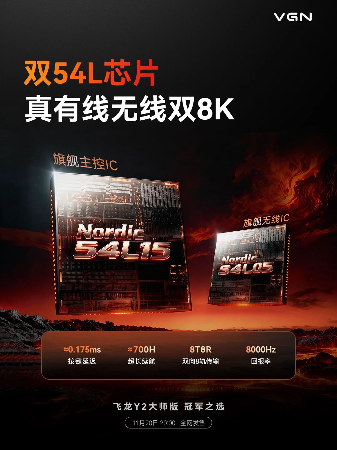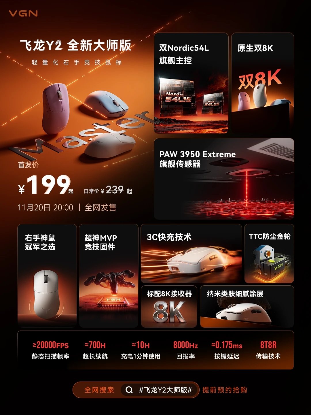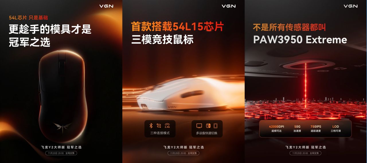 关于新鼠的最后一个消息,是VGN将于11月20日晚8点正式推出飞龙Y2的大师版,主控换装Nordic 54L15,也做了20000FPS的静态扫描帧速率,甚至,它还是双54L芯片的怪物。