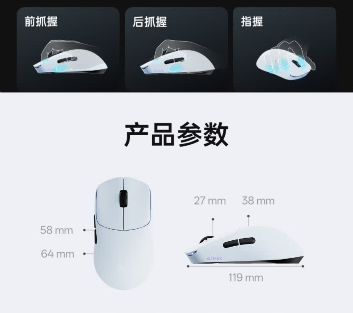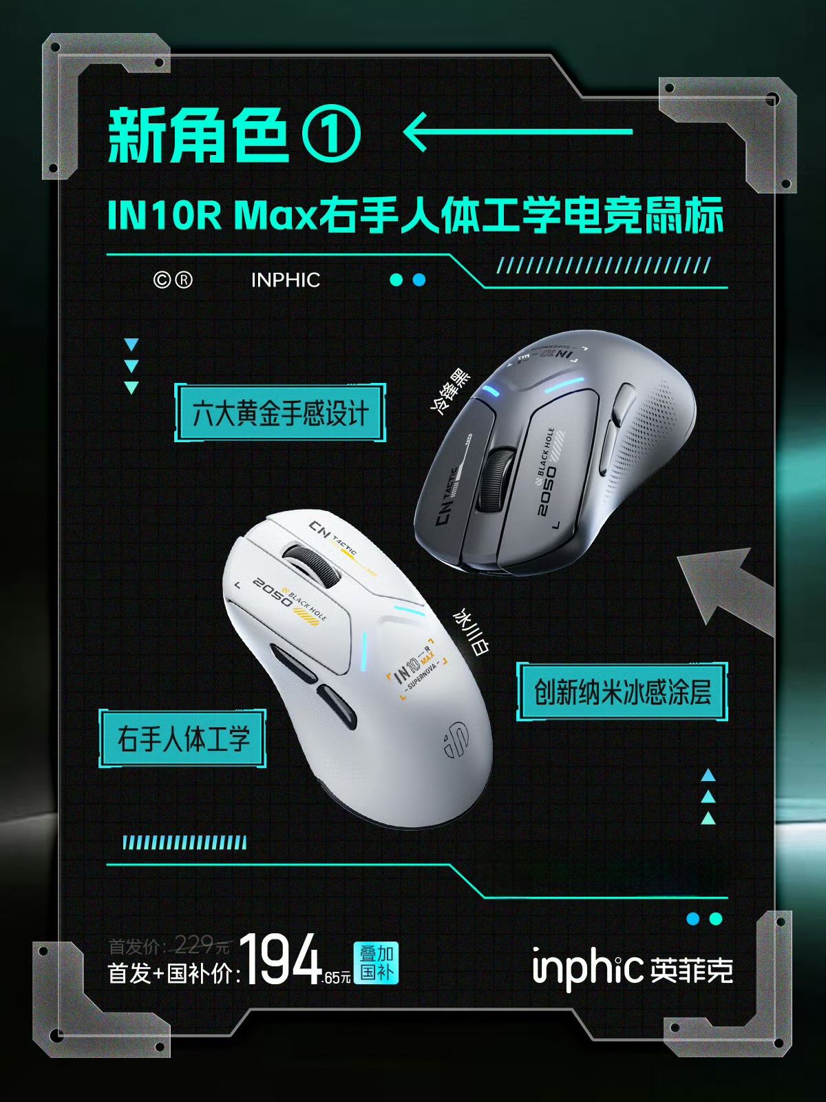 IN10 MAX采用对称设计,抓握/趴握皆可,11月10日晚8点京东/淘宝开启现货,首发229,叠加键鼠国补后194.65元,有星辉白和极夜黑两个配色可选。尺寸暂未公布,800mAh电池,重量控制在63g左右。