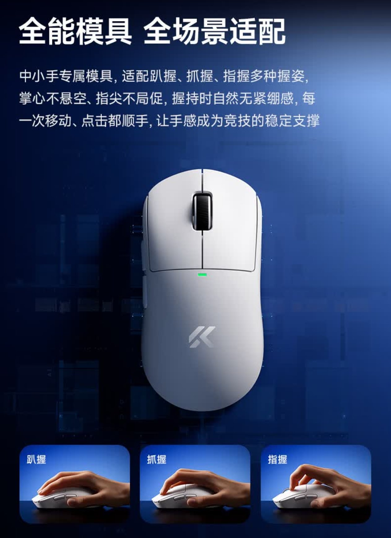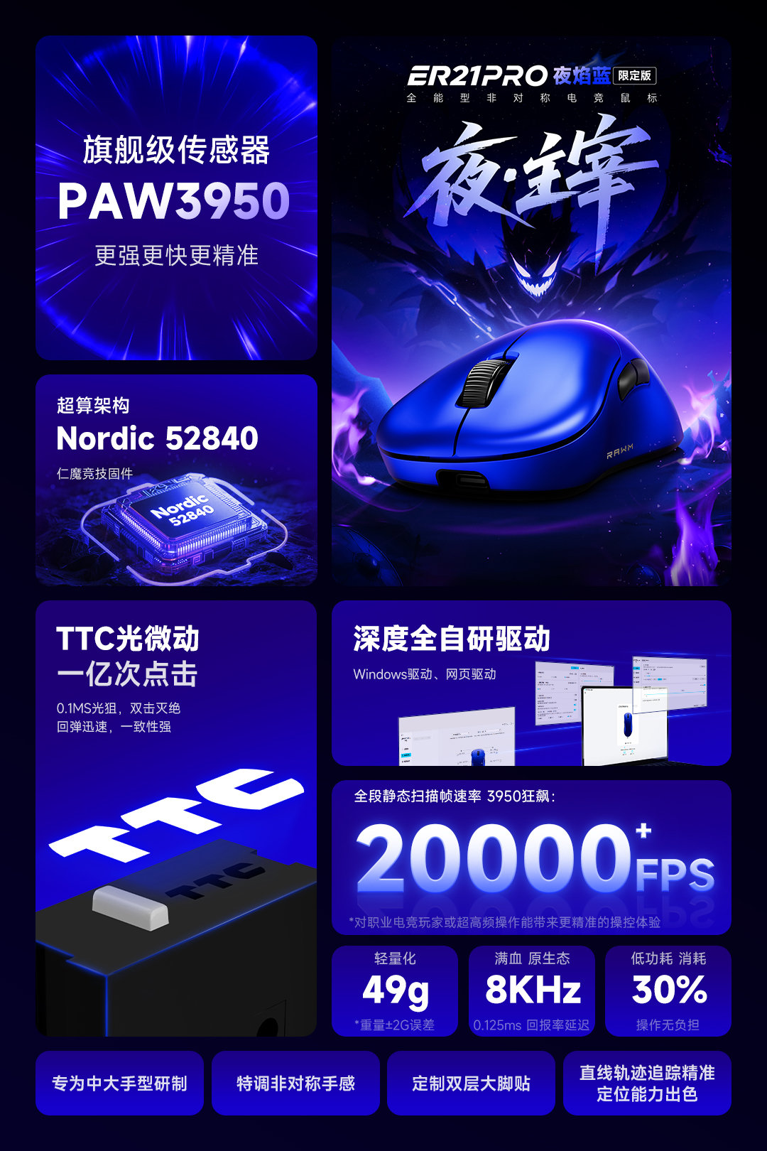 “缺货王”仁魔于11月6号晚8点在抖音官方旗舰店推出了非对称鼠ER21PRO的新配色——夜焰蓝限定版,定位中大手抓趴混合。相比此前发布的黑、白配色,虽贵了40块,但配置参数上并没有任何变化,类肤温感涂层,依就是有线1K,无线8K回报率,原相3950传感器+Nordic 52840主控,TTC光微动+TTC金轮机械编码器,300mAh电池却只做到了49g±2g的重量,内部集成水平属实一般。