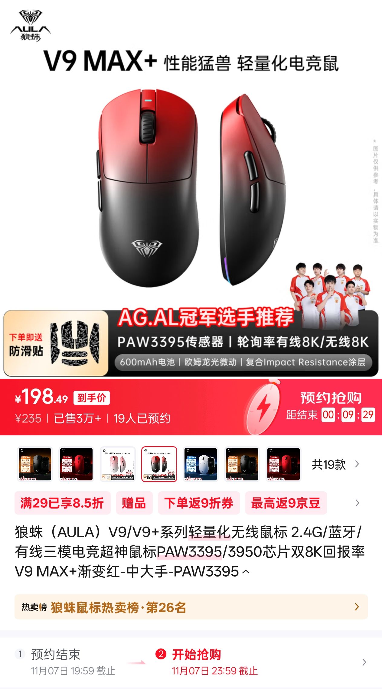 近两年在鼠标上比较弱势的狼蛛,趁着消费大节也马不停蹄的在11月7号晚8点于京东/抖音官方旗舰店发售了V9 MAX(中小手)/V9 MAX+(中大手),采用对称设计,适配抓握、趴握、指握三个姿态,主打渐变配色,有渐变粉、渐变红两个版本可选,京东首发领满29享8.5折键鼠券到手价199元,8号0点恢复为239元。