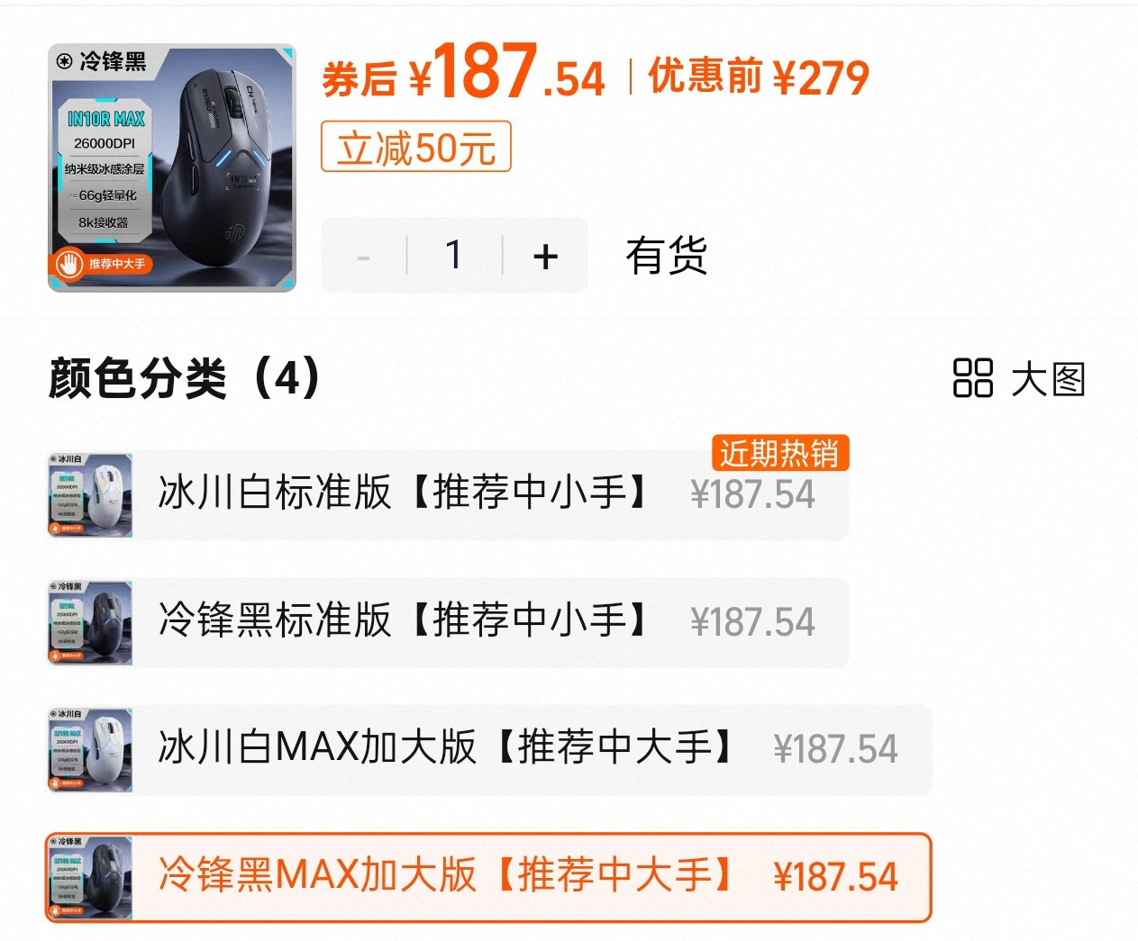 IN10R MAX则是市面非常罕见的后端加宽型右手非对称人体工学鼠,国内主流品牌还在坚持做这个模具的大概就只剩英菲克了。抓握、指握、趴握设计,冷锋黑、冰川白两个配色,尺寸125mm×74mm×44mm,800mAh电池,重量为66g左右。淘宝官方旗舰店已在10月31日开卖了,首发229,叠加键鼠国补并用淘金币抵扣后187.54元,京东自营要等到11月15日上午10点才发售。