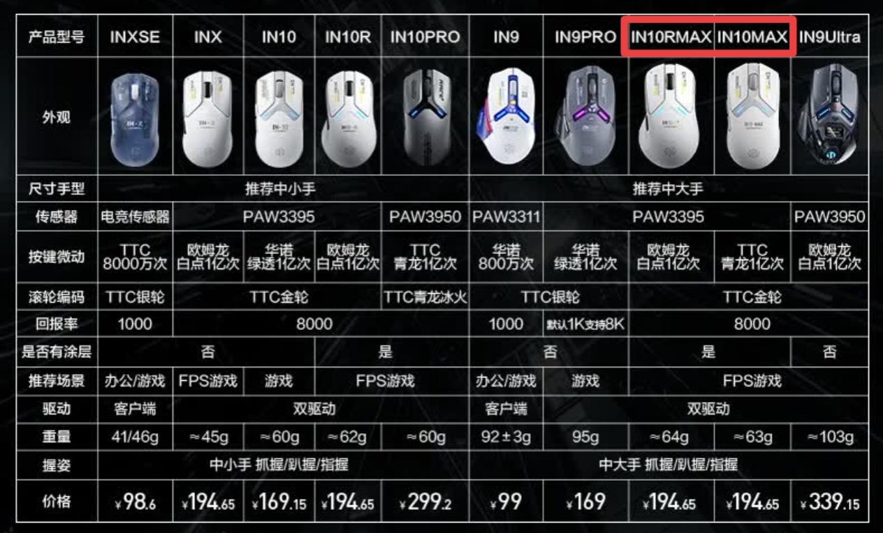 试图在市场中获得一席之地的英菲克,是行业内少有的比较钟情于中大手鼠标的品牌,最近给IN10系列搞了一波升级,顺势推出中大手版本的IN10 MAX和IN10R MAX。这是两款完全不同定位的产品。