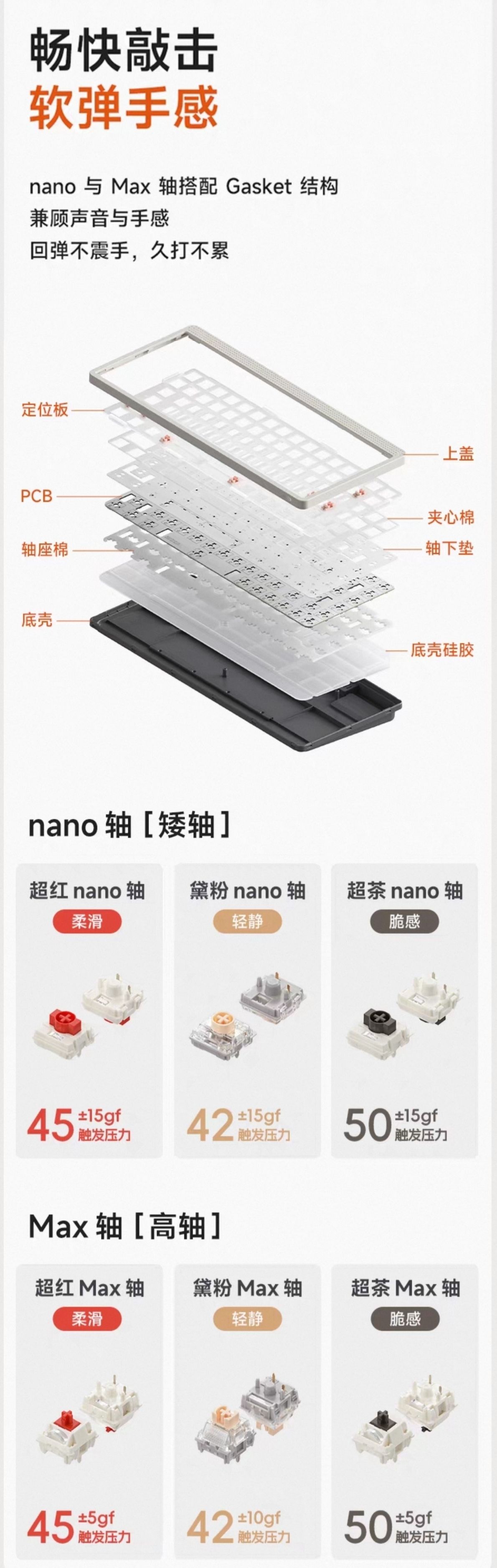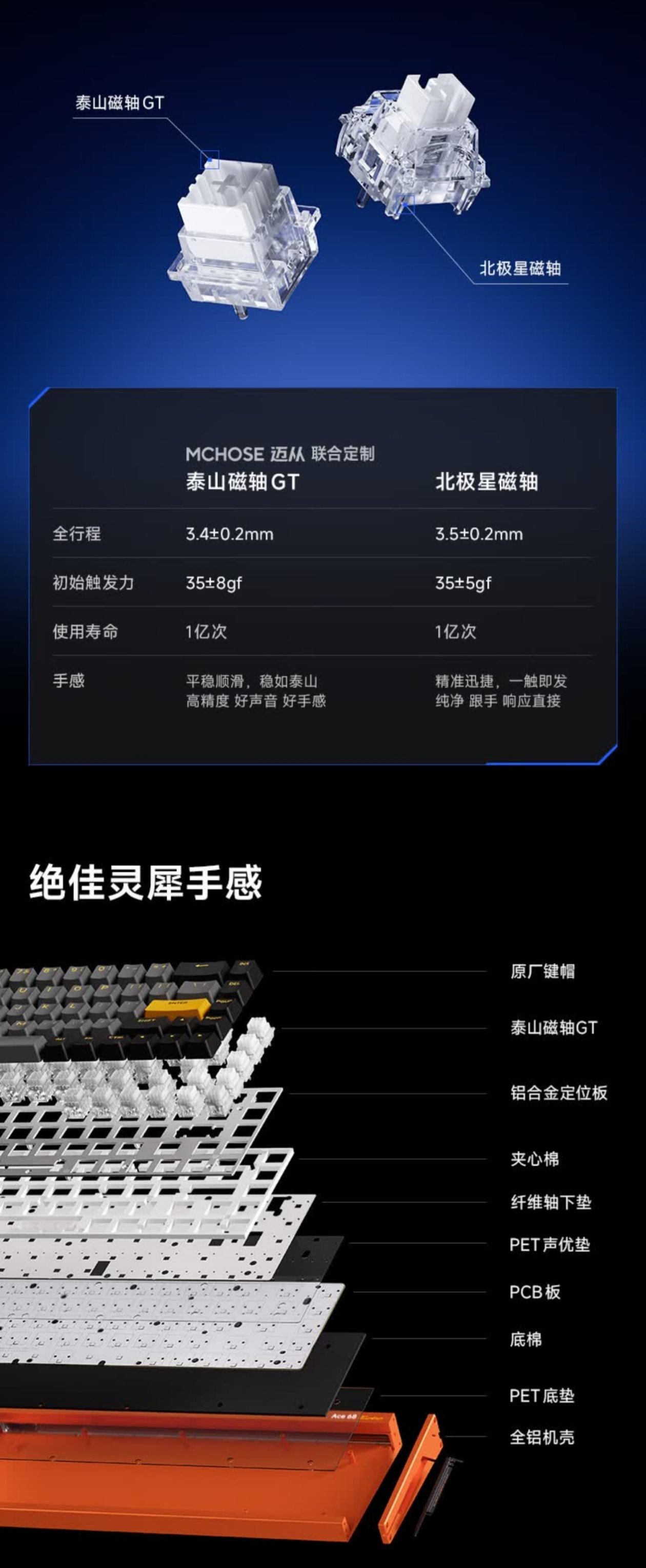 “16K回报率(仅限泰山磁轴GT版)”这几个字符实在太过耀眼,剩下的其它卖点似乎都显得很苍白。可能很多人对扫描率和回报率两个概念不太了解,其实它跟手机屏幕上的触控采样率和反馈率是近似的东西。键盘的扫描率简单点讲,就是键盘每秒所能达到的,收集用户输入信息的频次,而回报率则是每秒内键盘能做出多少次信息反应的频率,拿16K回报率举例,也就是每间隔1/16000(16K)秒做出一次输入信息的响应,根据1秒=1000毫秒进行换算,1/16000s再乘以1000可得出0.0625ms的结果,这便是Ace68 Tubro所标注的0.06ms延迟的由来,当然这仅仅是理论速度,整个过程中你还得考虑包括按键抬起在内的其它硬件的响应时间,最后加在一起,才算是键盘的实际响应时间。我们再拿8K回报率举例,即每间隔1/8000秒做出一次输入信息的响应,1/8000s乘以1000ms的单位换算,得出0.125ms的理论数据,所以现在你知道为什么经常看到8k回报率的键盘会标这个延迟数值了吧,1ms则是1K回报率的理论响应时间(1÷1000×1000)。而回报率的高低,跟主控芯片的水平息息相关,这点从Ace68 Tubro泰山磁轴GT版升级成综合主频512MHz的双核MCU也能看出来。但,有人要问了,北极星磁轴的8K回报率版延迟是怎么是0.08ms?八成实验室数据,还不知道主控芯片拿什么条件跑出来的呢,都超过8K回报率0.125ms的理论速度了,之前ATK RS6系列标的0.08ms就同为实验室数据。可扫描率为何总要比回报率高?因为只有这样,才能不漏掉用户的每一次信息输入,保证其准确性,配合足够好的回报率,从而做到所谓的“高跟手性”。