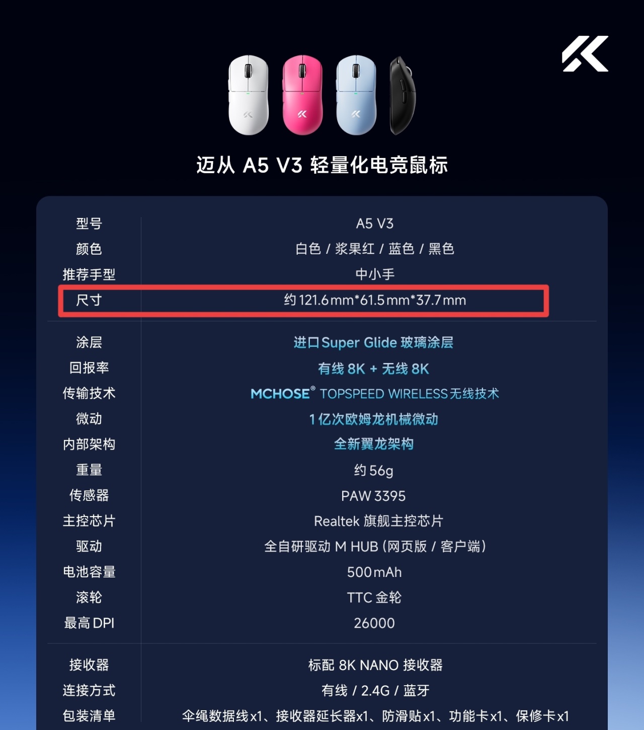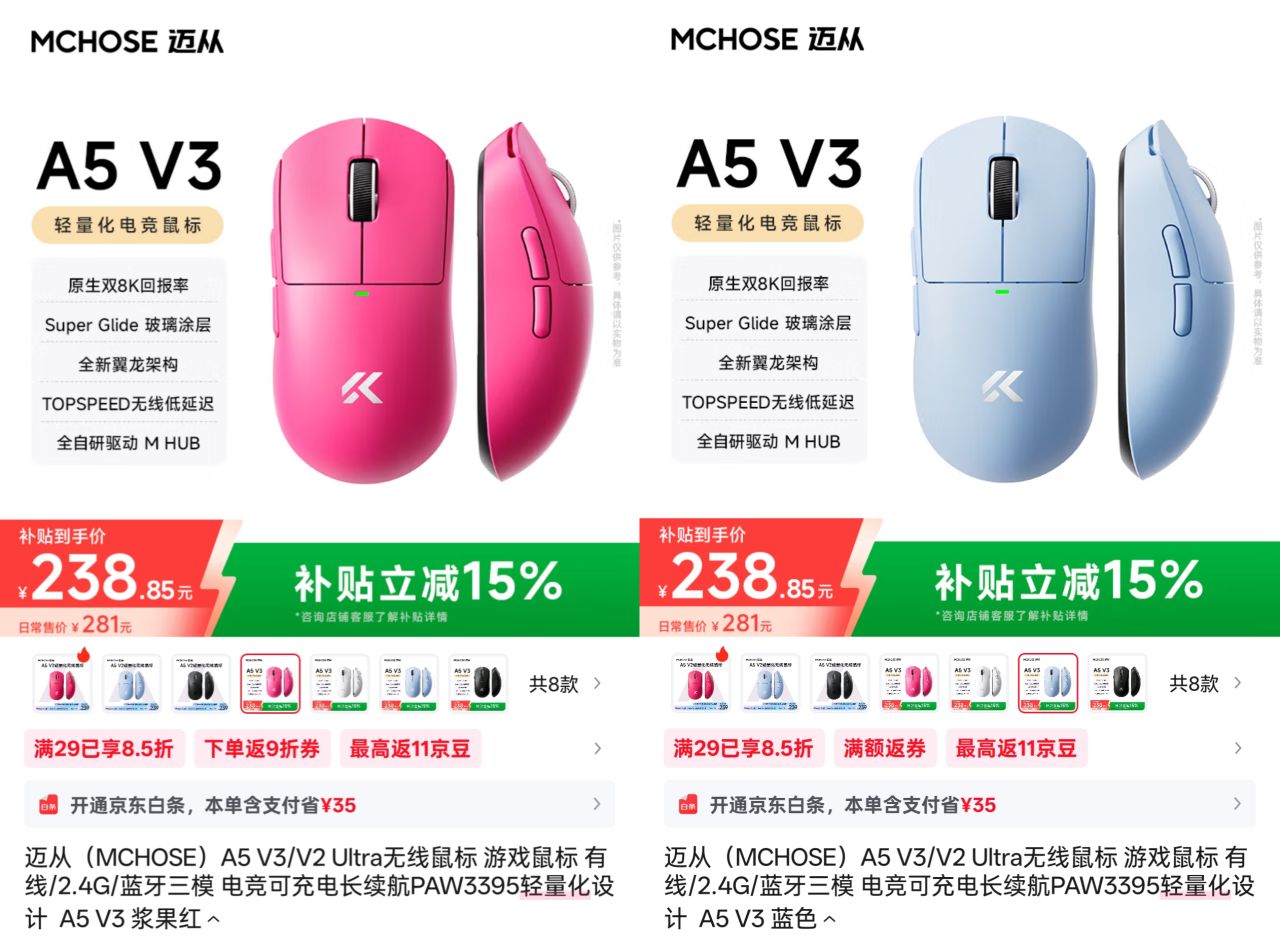 迈从的鼠标经常会让人丈二和尚摸不着头脑,找不到卖点在哪,如果说狼蛛V9 MAX/V9 MAX+还可以勉强用渐变色外观跟差异化攀扯上关系,那下面这款11月10号上午10点开售的迈从A5 V3就只能称它定价自信了。