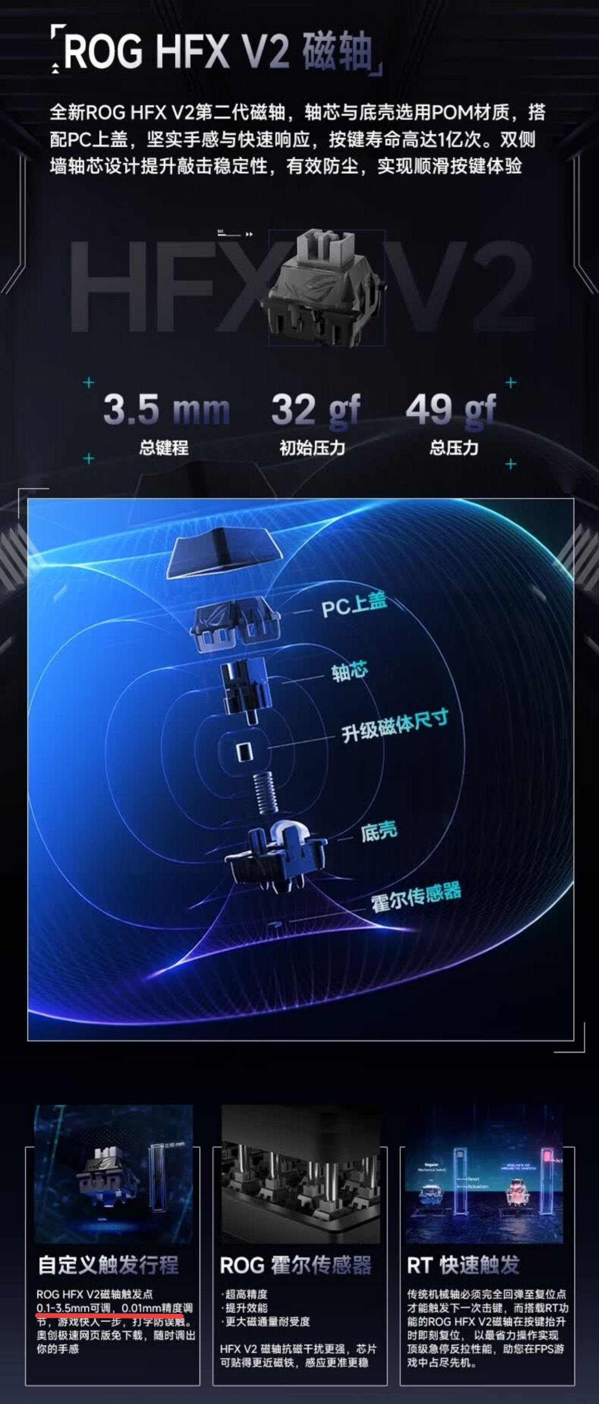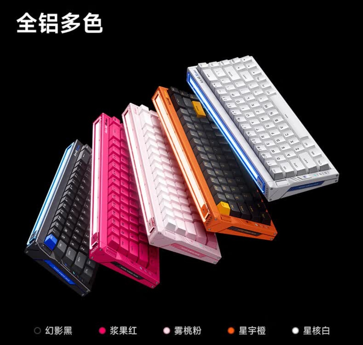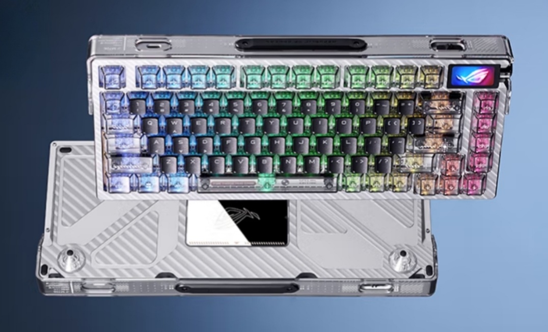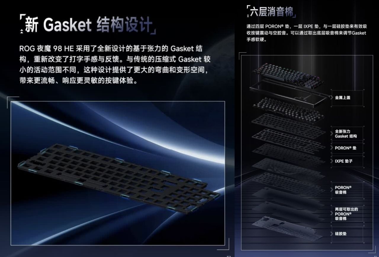 夜魔98HE为有线无线双8K回报率,并支持蓝牙连接,是磁轴里非常稀缺的98配列设计,带1.47英寸OLED彩屏和侧边旋钮,附赠分离式硅胶掌托,采用Gasket结构,铝合金上盖,六层填充,换装全新ROG HFX V2第二代磁轴,裸机重约1375g,活动定价2299元,黑白两个配色,虽未公布电池容量,但不会超过8000mAh。