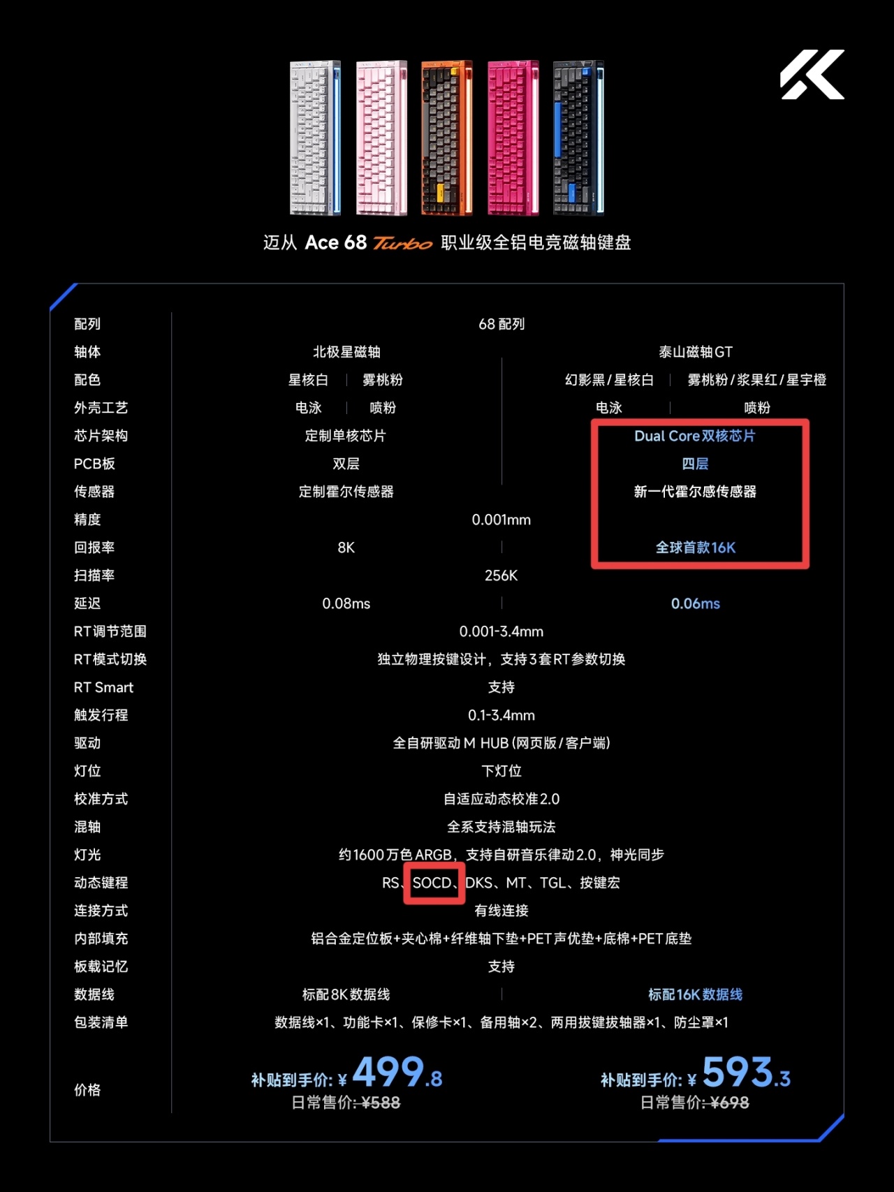 在磁轴赛道与VGN激烈对垒的迈从,也终于拿出了自己的600元价位新作——Ace68 Tubro,已于10月27日晚8点在京东/淘宝正式开售,有线连接,北极星磁轴跟泰山磁轴GT两个版本,二者京东旗舰店首发定价分别为588/699,补贴价499.8/593.3元。因为之前开售过的两次,供货很少,而11月10日晚8点的第三次抢购,才算进行了比较大批量的现货供应,故仍将它列入近期新品一栏。需注意!北极星磁轴版本跟泰山磁轴GT版本的性能是不一样的。