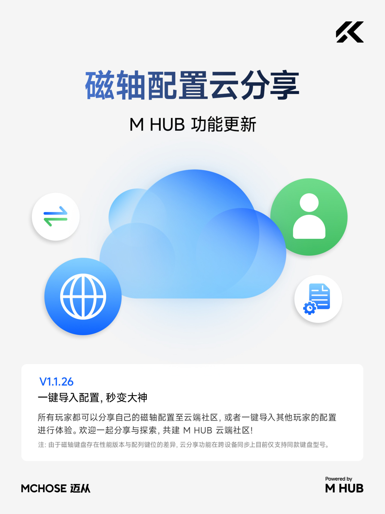 顺便提一嘴,迈从M HUB最新的V1.1.26驱动版本现已支持所有玩家分享自己的磁轴配置至云端社区,用户可一键导入其他玩家的磁轴配置进行使用。好东西嗷。