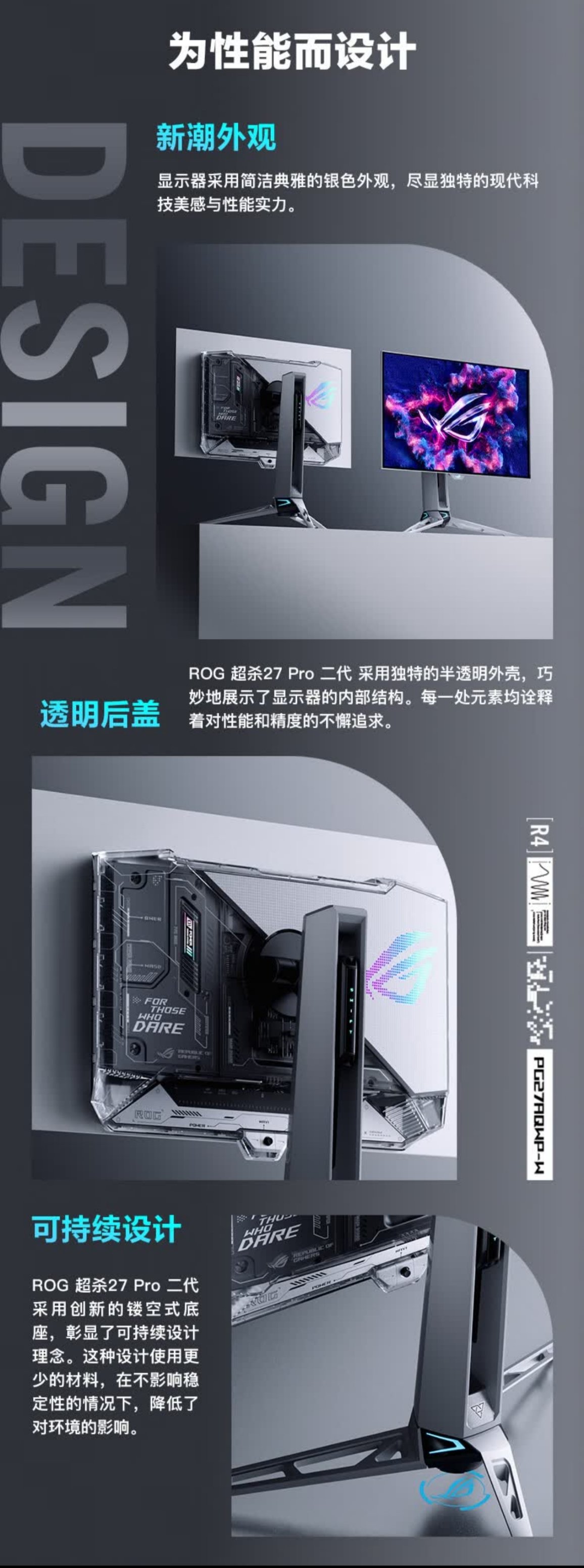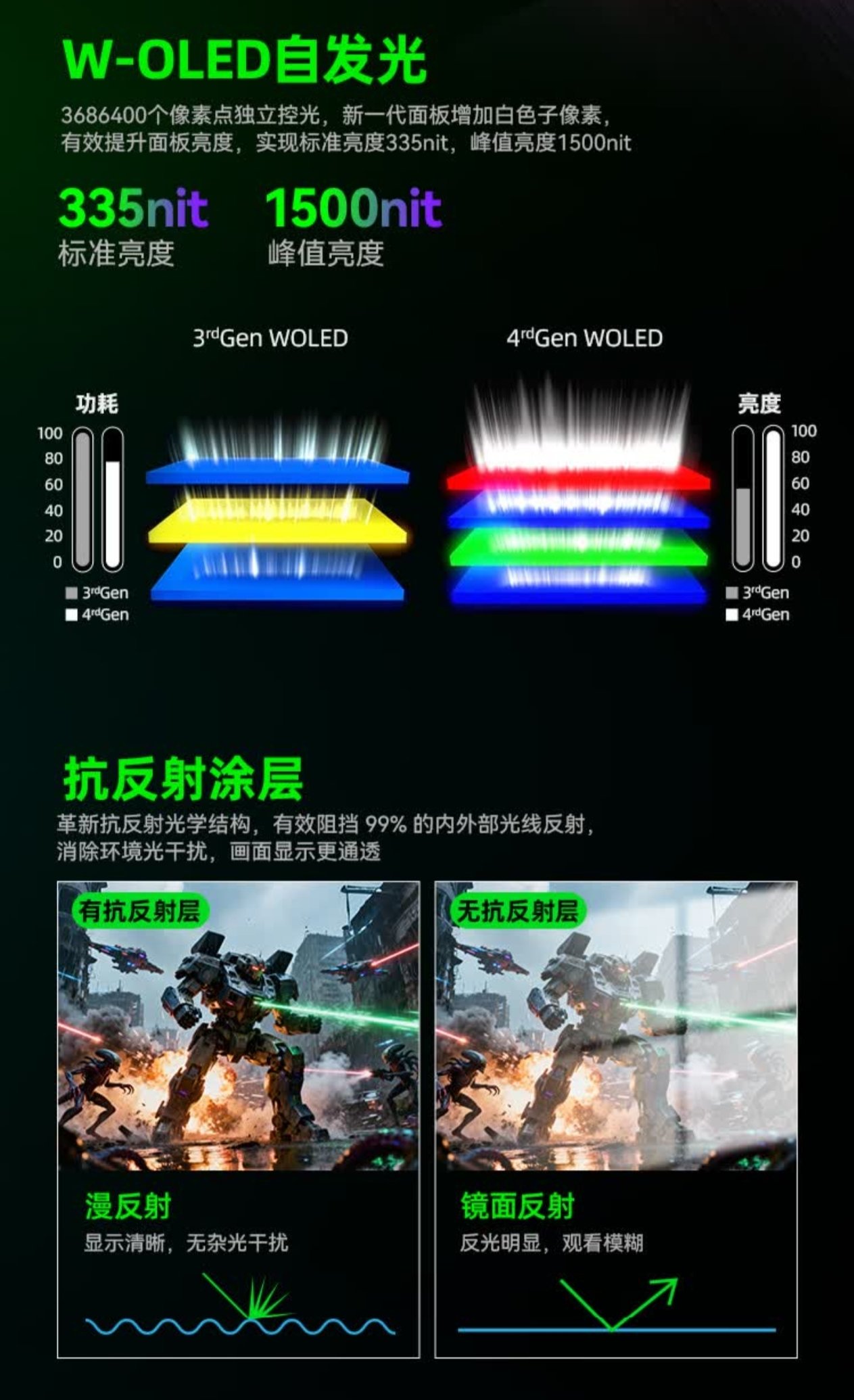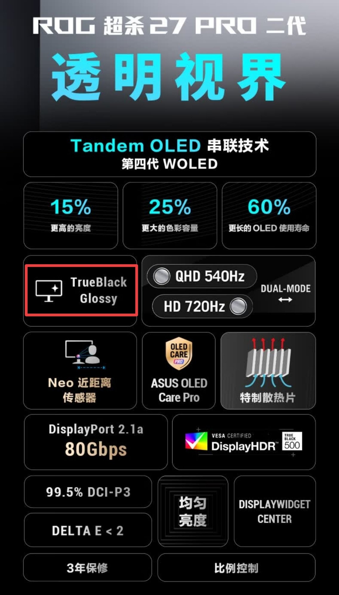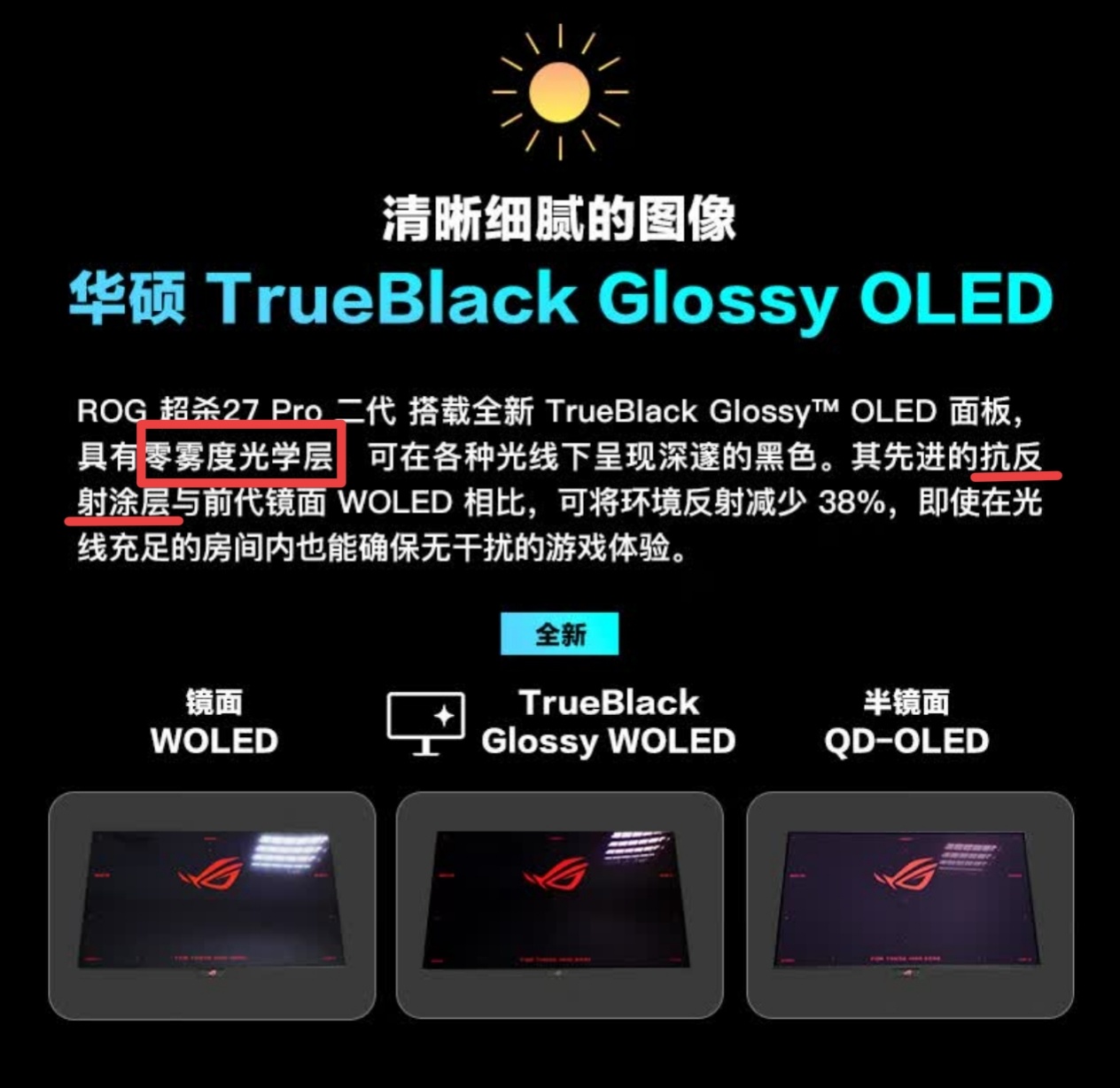 看到图里"ROG 超杀27Pro二代"那几个字下面的副标题了没——“透明视界",重点来了!TrueBlack Glossy?零雾度光学层?抗反射涂层?这不低反镜面屏嘛!!!还是OLED,通透度起飞!