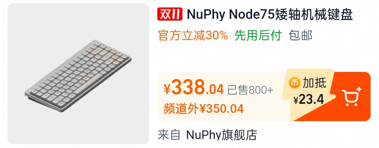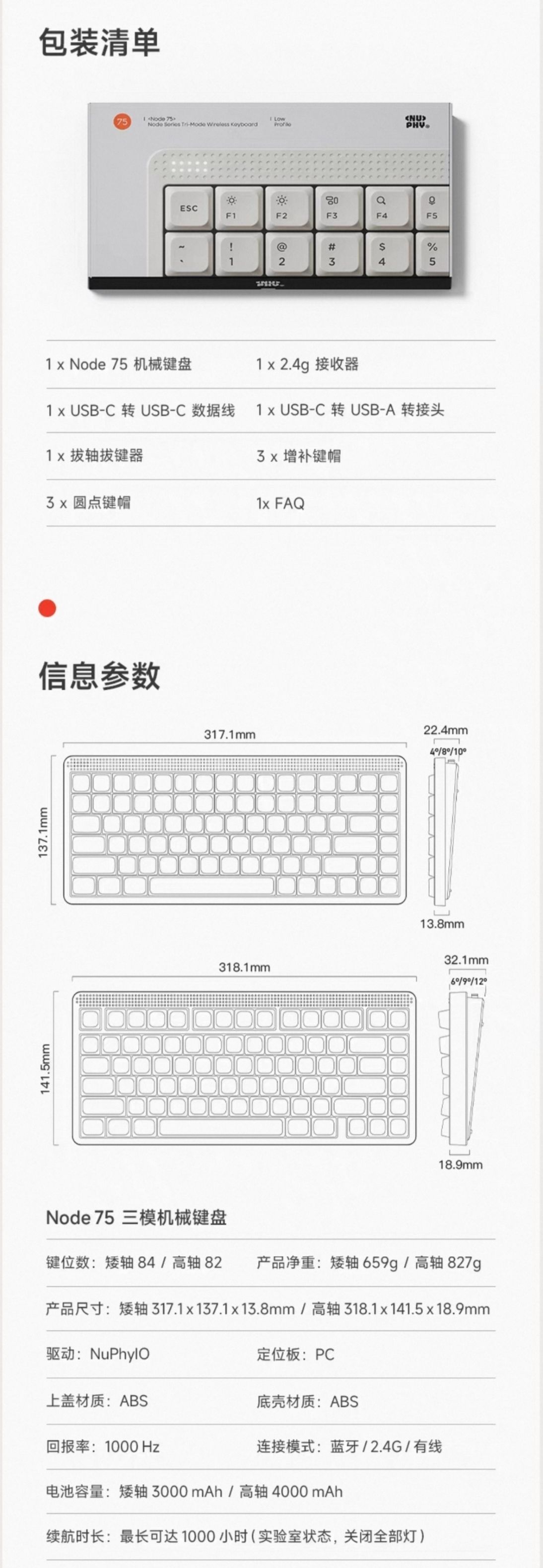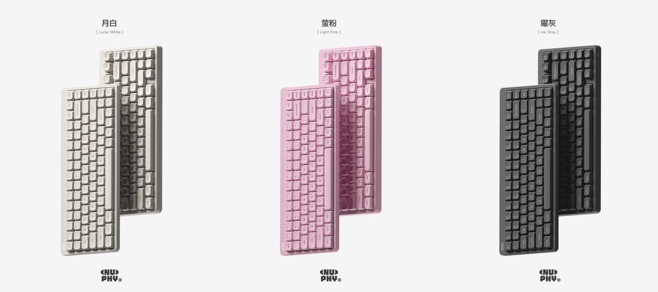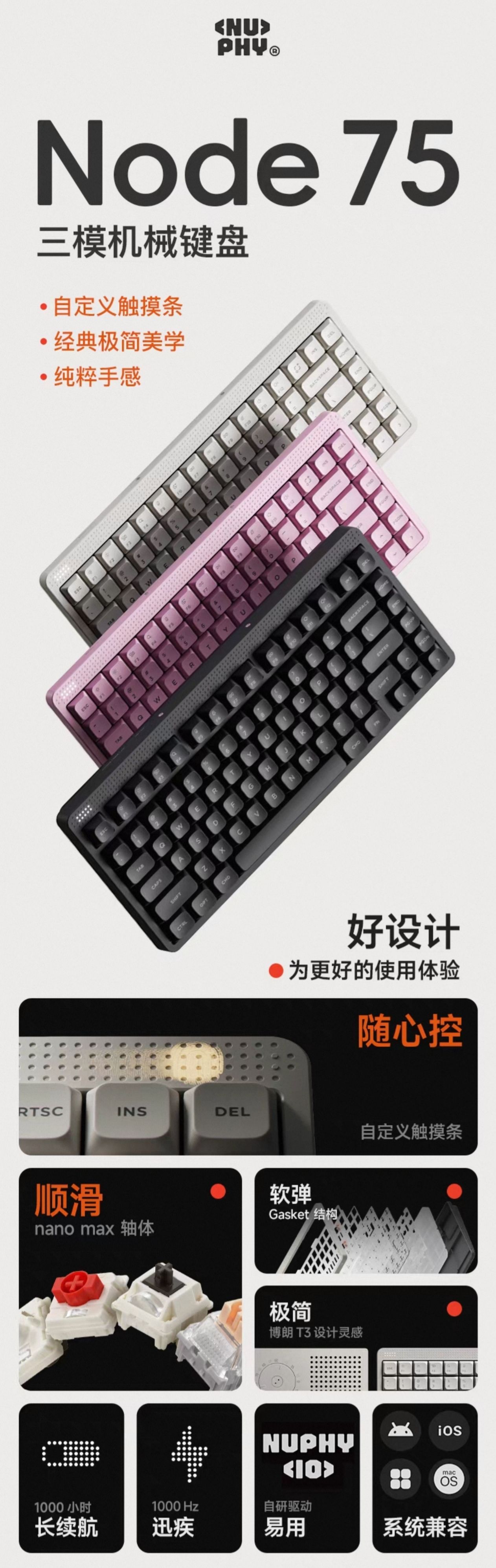 Nuphy在11月5日下午6点,于淘宝旗舰店正式推出Node 75三模机械键盘,Mac/Windows/Android/IOS系统皆可,主打极简设计,Gasket结构,PC定位板,ABS塑料机身,PBT键帽,有线无线1K回报率,蓝牙124Hz,矮轴版本84键,13.8mm前高,3000mAh电池,689g重;高轴版本82键,18.9mm前高,4000mAh,电池827g重,每个版本都有线性红轴,静音轴(黛粉轴),茶轴三个种款式选择,首发399元,淘宝88vip九折券叠淘金币抵扣后338元,有月白、萤粉、曜灰三个配色。