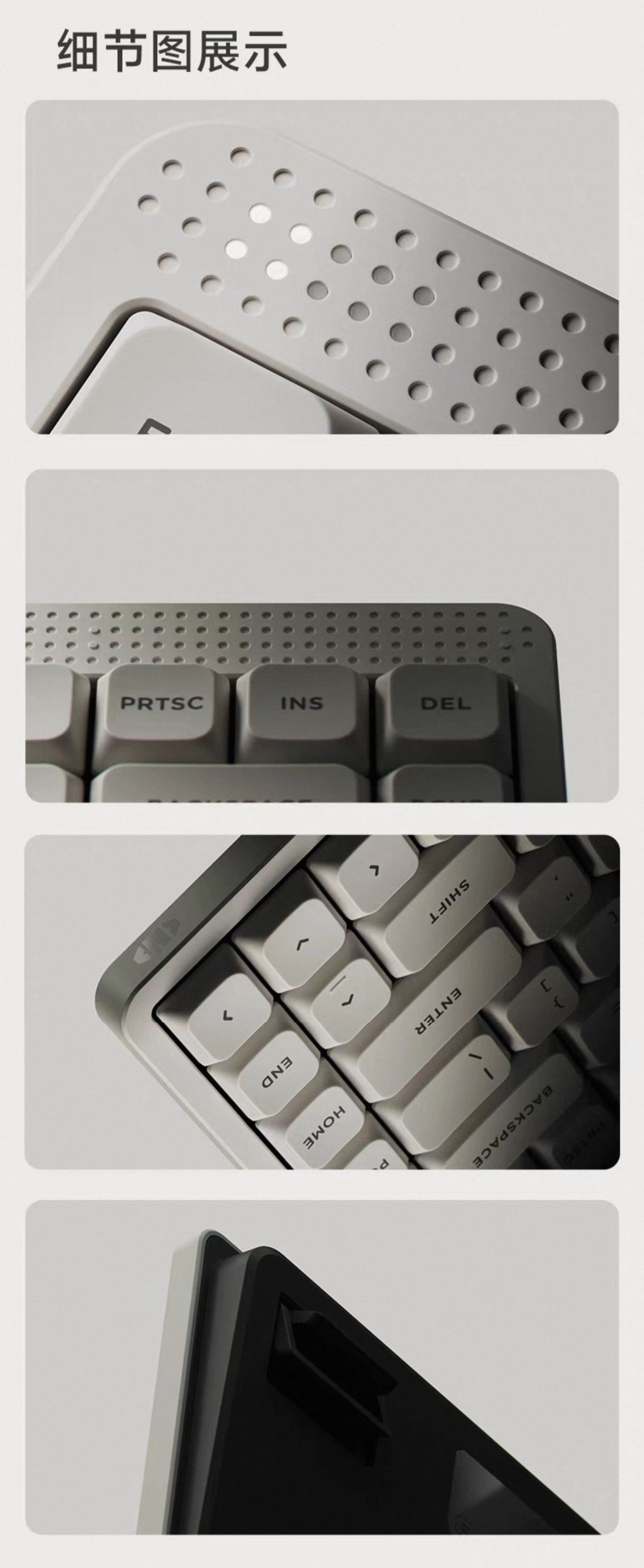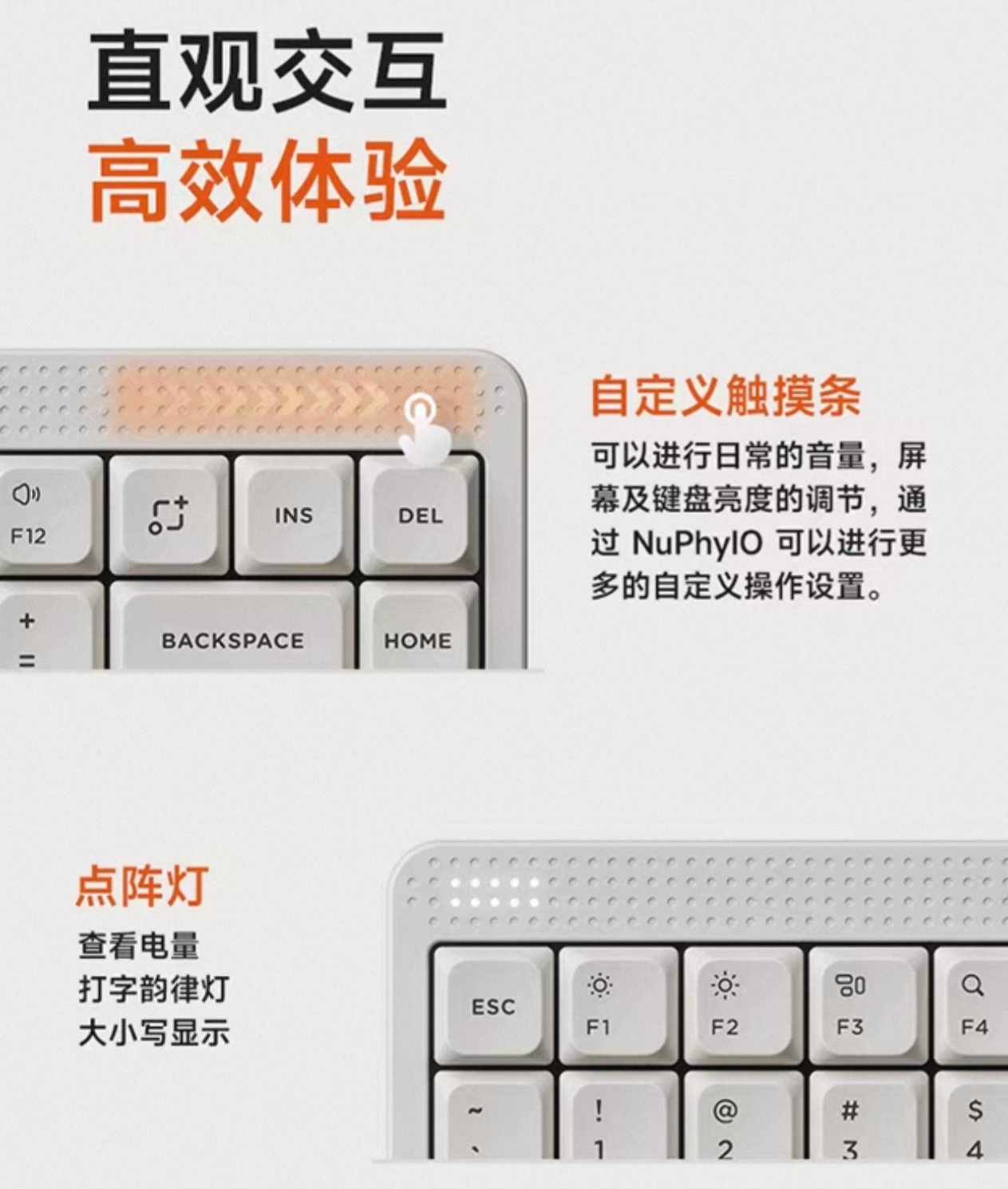 键盘的顶部设计了一排点阵小孔,左端放置了两行提示灯,右端集成了可自定义操作的触摸条,兼顾美观与实用,很细节嗷就是配件里没送防尘罩,也忒抠了点