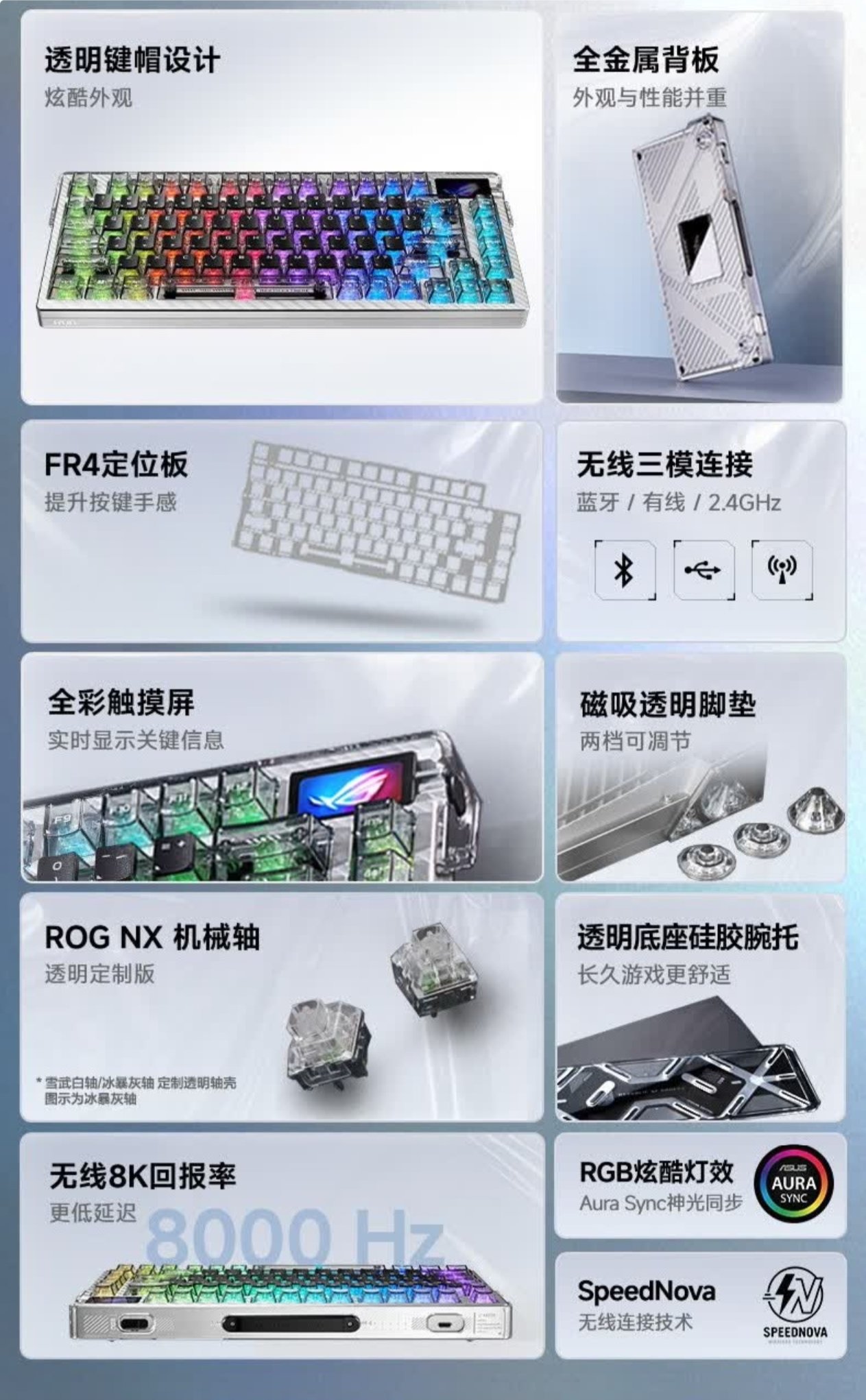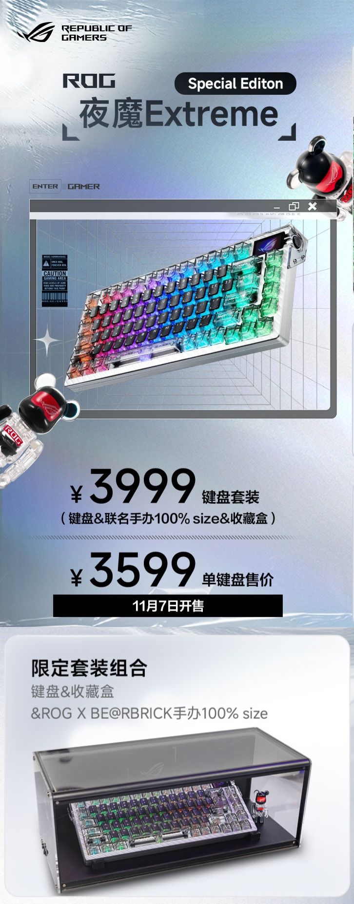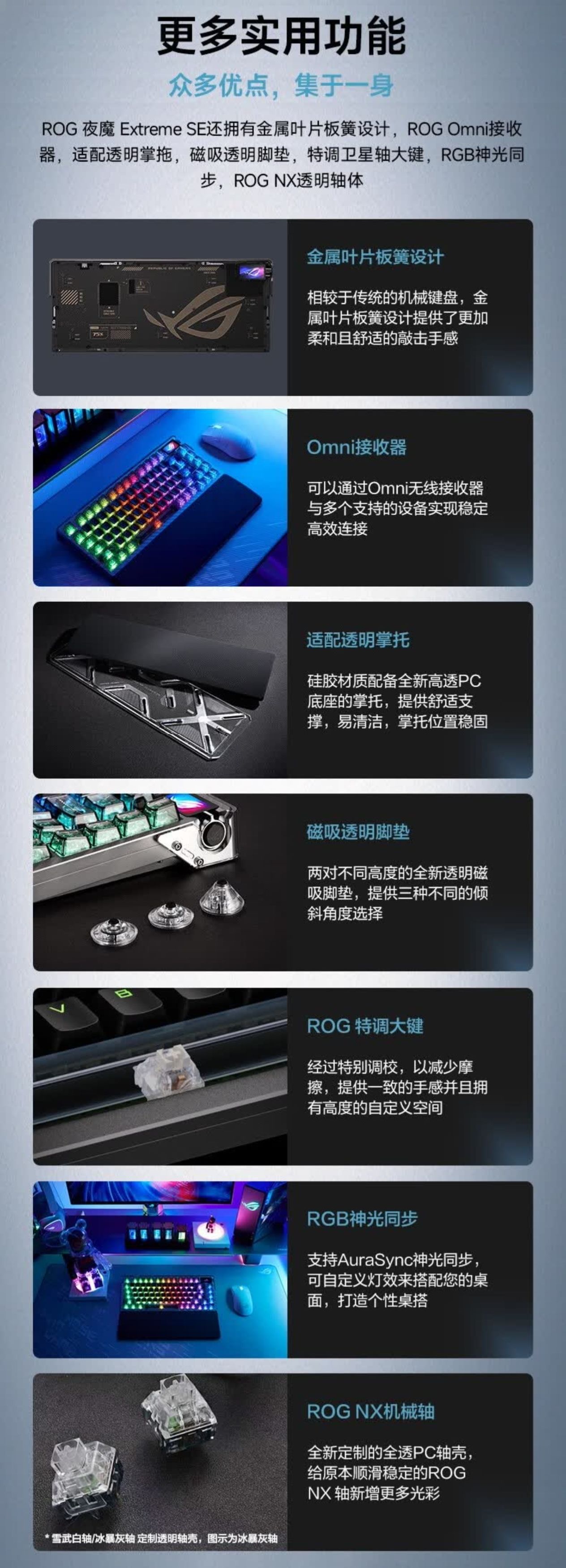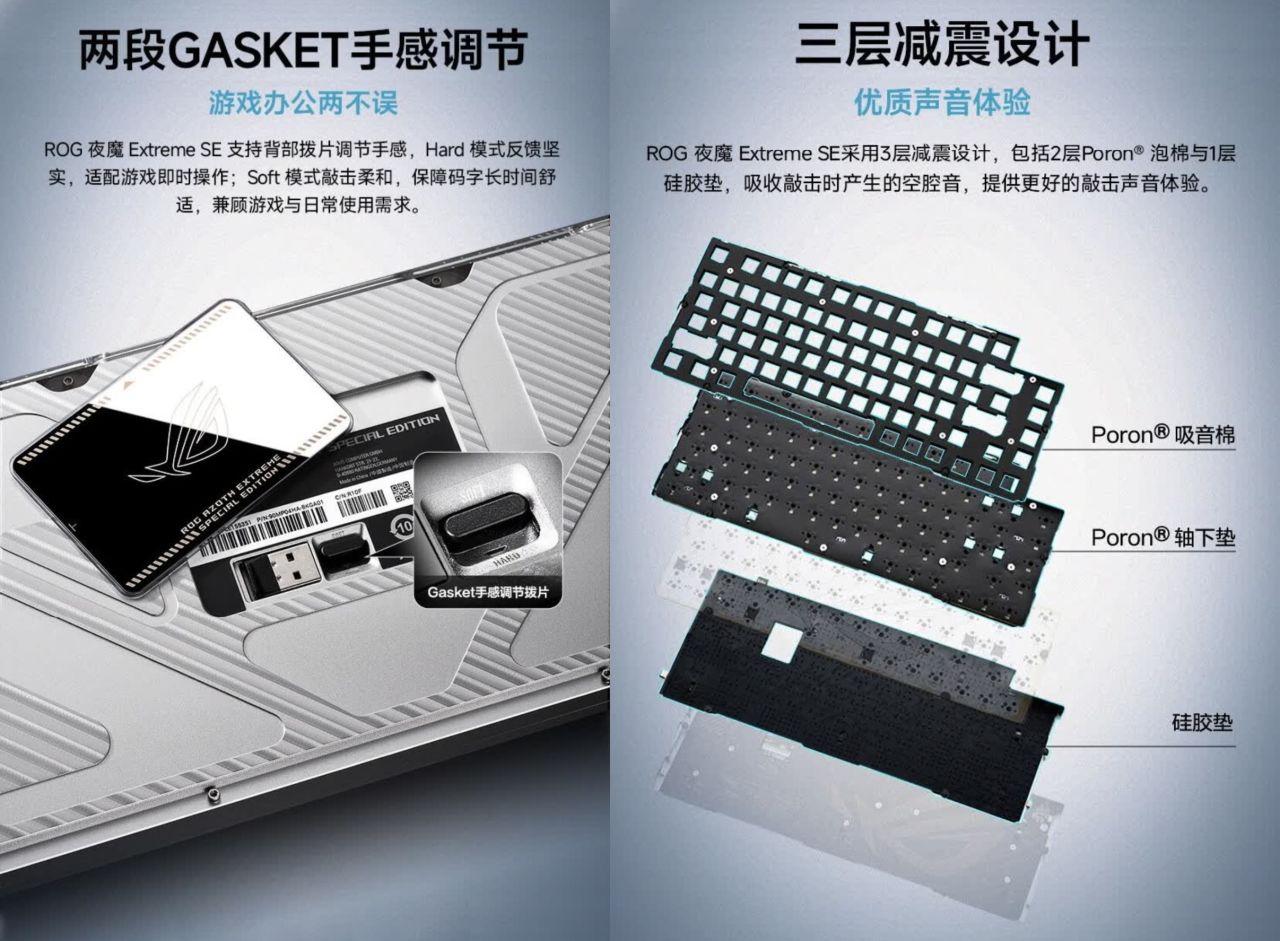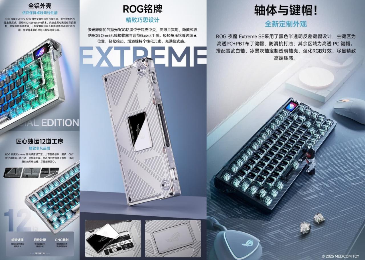 至于夜魔Extreme SE,实在觉得作为一把三模机械键盘,哪怕是ROG,也很难支撑起3599的售价。产品本身也没什么独特亮点,有线无线8K回报率、FR4玻纤定位板、全铝机身、Gasket结构、两段手感可调、全透轴体、小屏幕,这些,都不是啥新东西,好在依然有赠掌托,但轴体的具体参数,暂未解密。