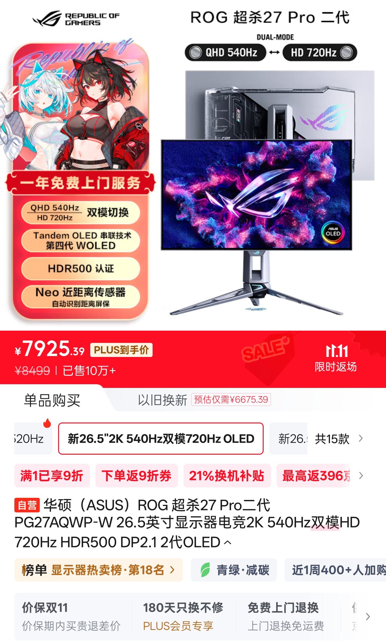 “败家玩意”ROG率先在11月1号开售超杀27Pro二代,26.5英寸,型号为PG27AQWP-W,搭载第四代LG W-OLED面板,采用2K 540Hz/720P 720Hz双模设计,配备80Gbps速率的DP2.1a接口,京东首发定价8499元,叠PLUS会员券后7925元,这价格,估计除了外观党,大家都只能望而却步了,但以上种种,统统不是我们要关注的重点。