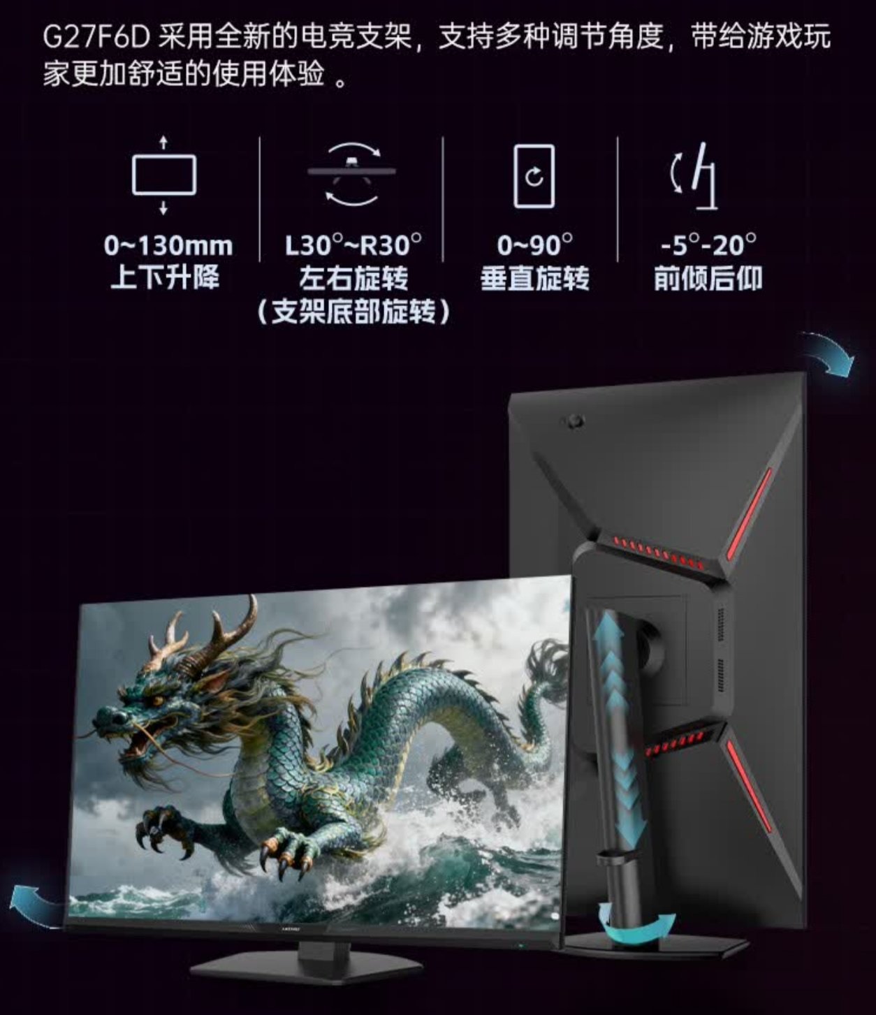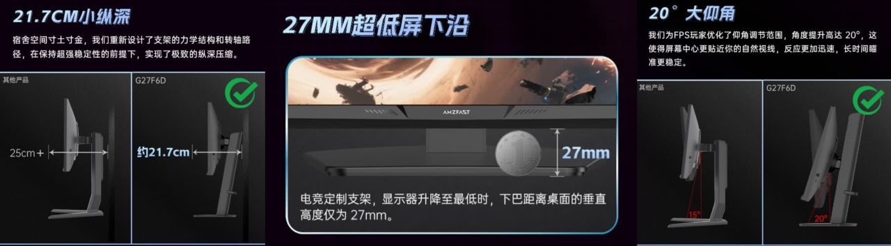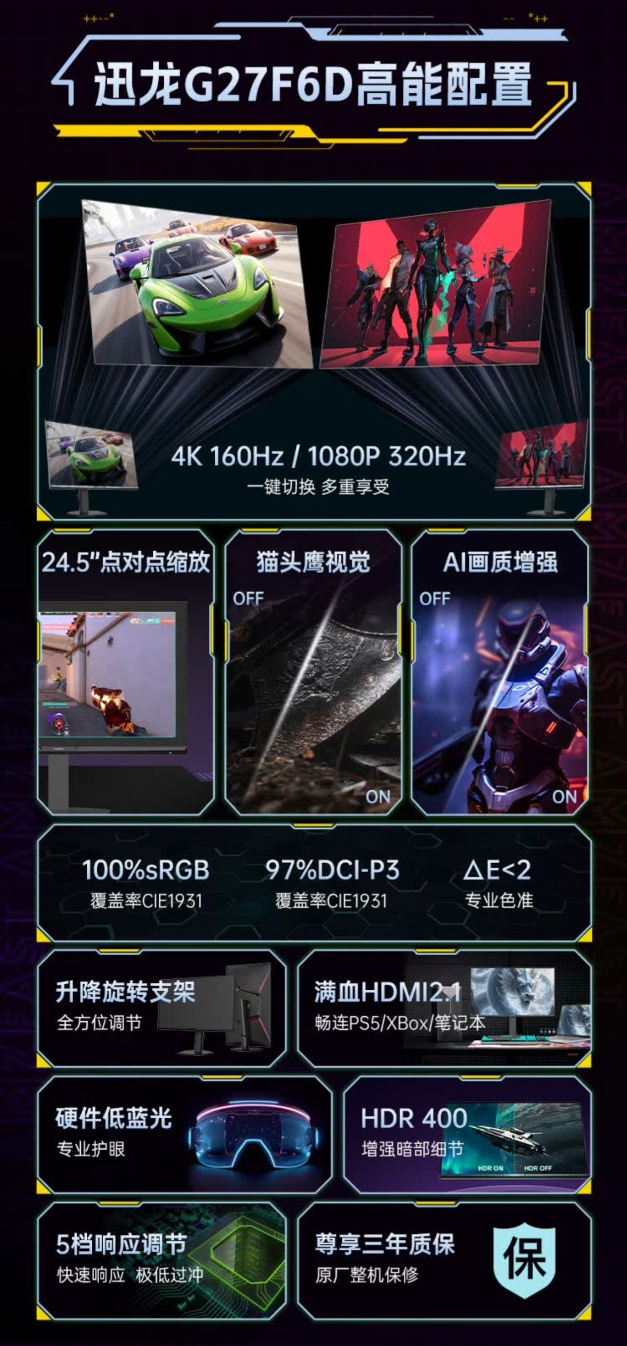 迅龙Max G27F6D于11月10号上市,为27英寸4K 160Hz/1080P 320Hz双模显示器,采用Fast IPS面板(推测来自友达),400nits亮度(非Display HDR400认证),硬件低蓝光,48Gbps满血HDMI2.1接口(自带DP1.4线,HDMI2.1线材需另购),全程DC调光,标称覆盖100%sRGB和97%DCI-P3色域,支持24.5英寸点对点缩放,拥有升降旋转、俯仰调节功能。