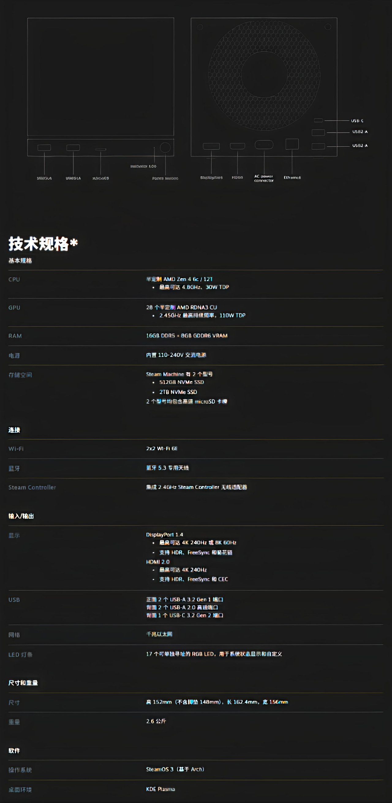 这款由Valve自研自销的设备采用统一硬件规格,立方体机箱内置大尺寸散热器,提供512GB/2TB M.2 2230 SSD版本,支持磁吸外壳更换(将开放3D CAD文件)与硬件升级——M.2插槽兼容2230/2280规格SSD,笔记本规格内存也可替换(拆卸难度较高)。