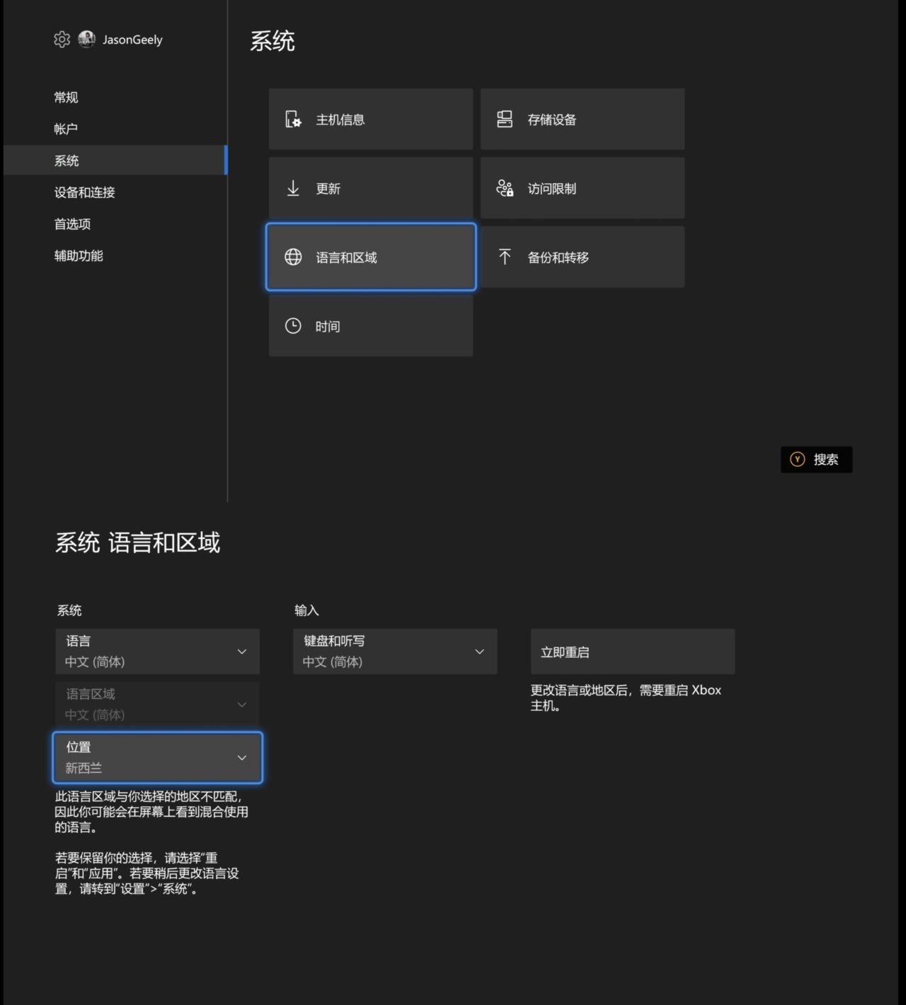 打开 Xbox 主机的“设置,登录个人账号后,进入“系统”选项,选择“语言与地区,在“位置”中选择新西兰完成更改
