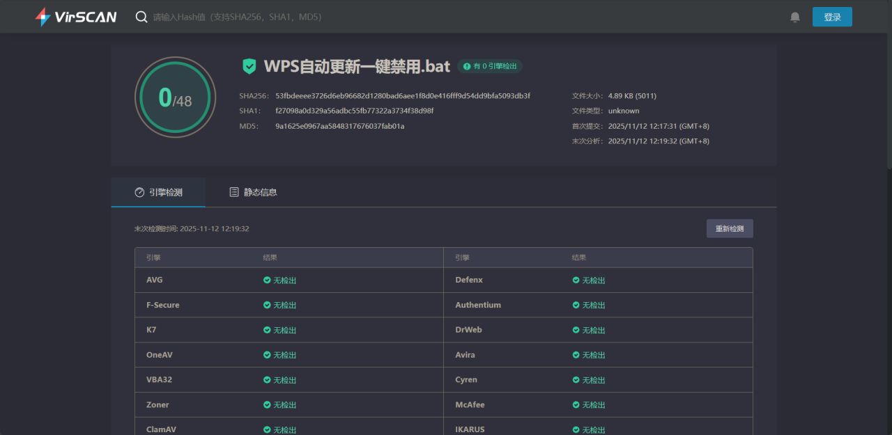 WPS自動更新一鍵禁用的bat命令已經經過VirScan在線病毒查殺,48個殺毒引擎均無檢測出病毒和異常,放心實用。