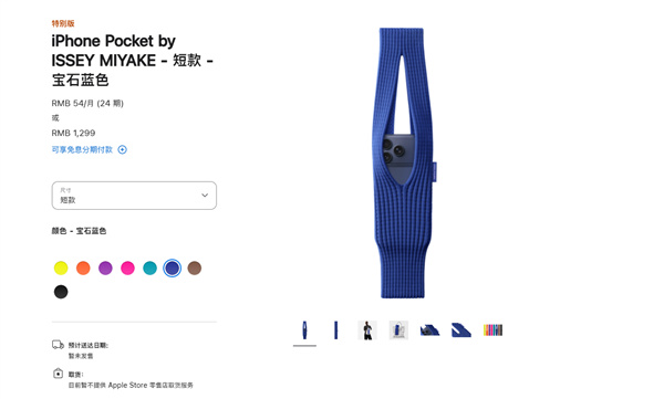 据了解,iPhone Pocket短带款提供柠檬色、柑橘色、紫色、粉色、孔雀绿色、宝石蓝色、肉桂色和黑色八种色彩,长带款提供宝石蓝色、肉桂色和黑色三种色彩。