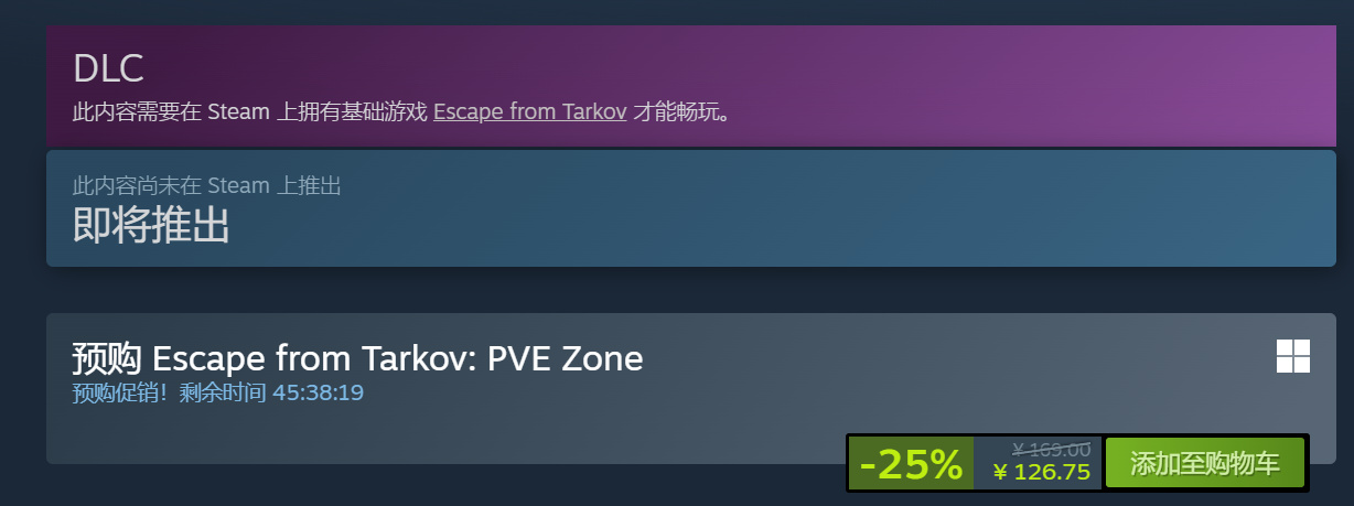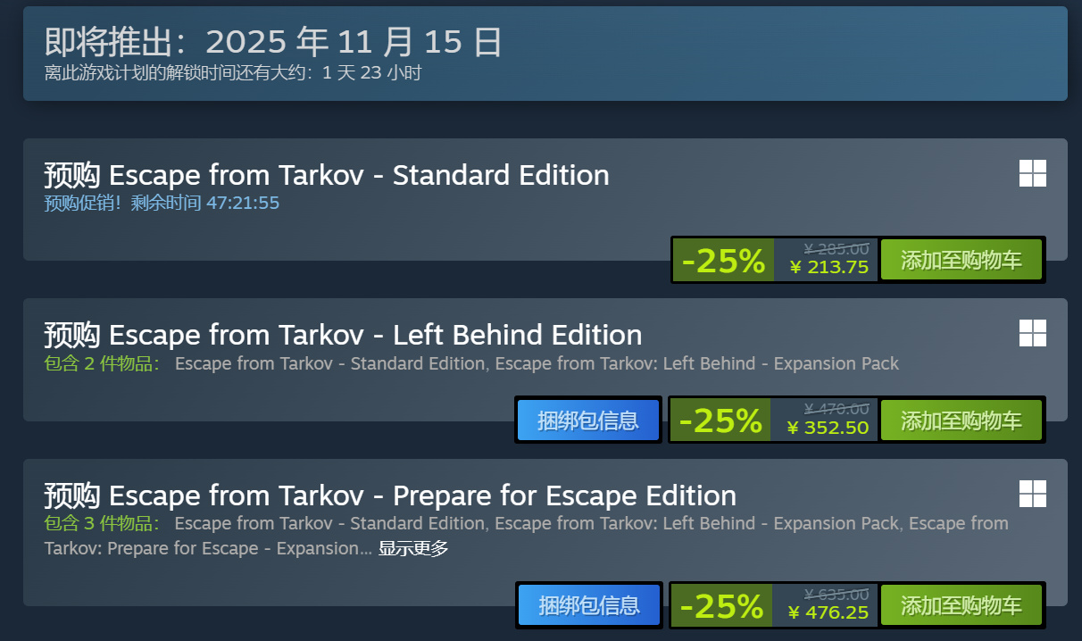 《逃離塔科夫》Steam現已開啓預購,預購75折特惠,標準版售價¥213.75,生還者版¥352.5,準備逃離版售價¥476.25,PVEZ售價¥126.75,遊戲將於 2025 年 11 月 15 日登陸 Steam 平臺。