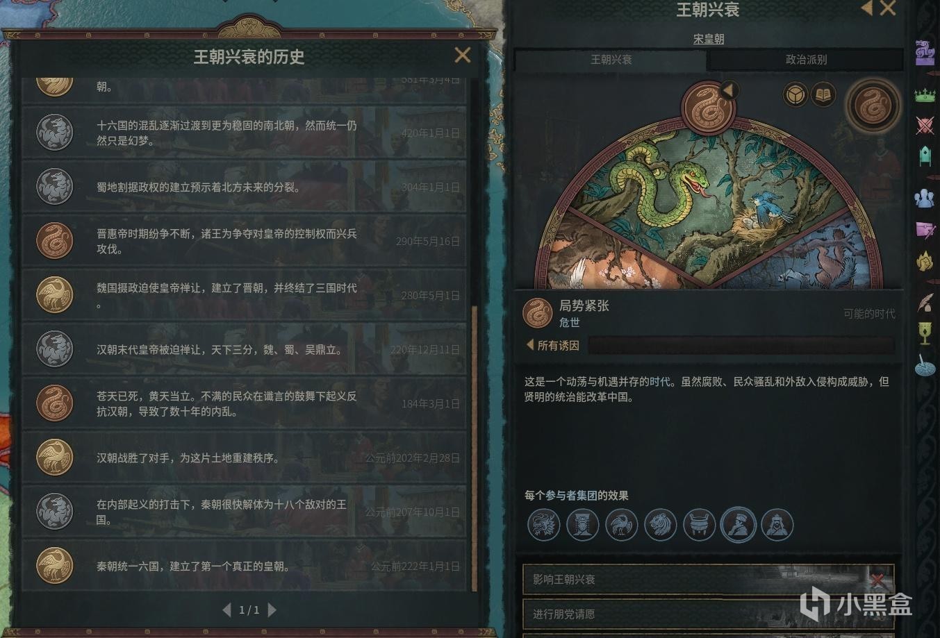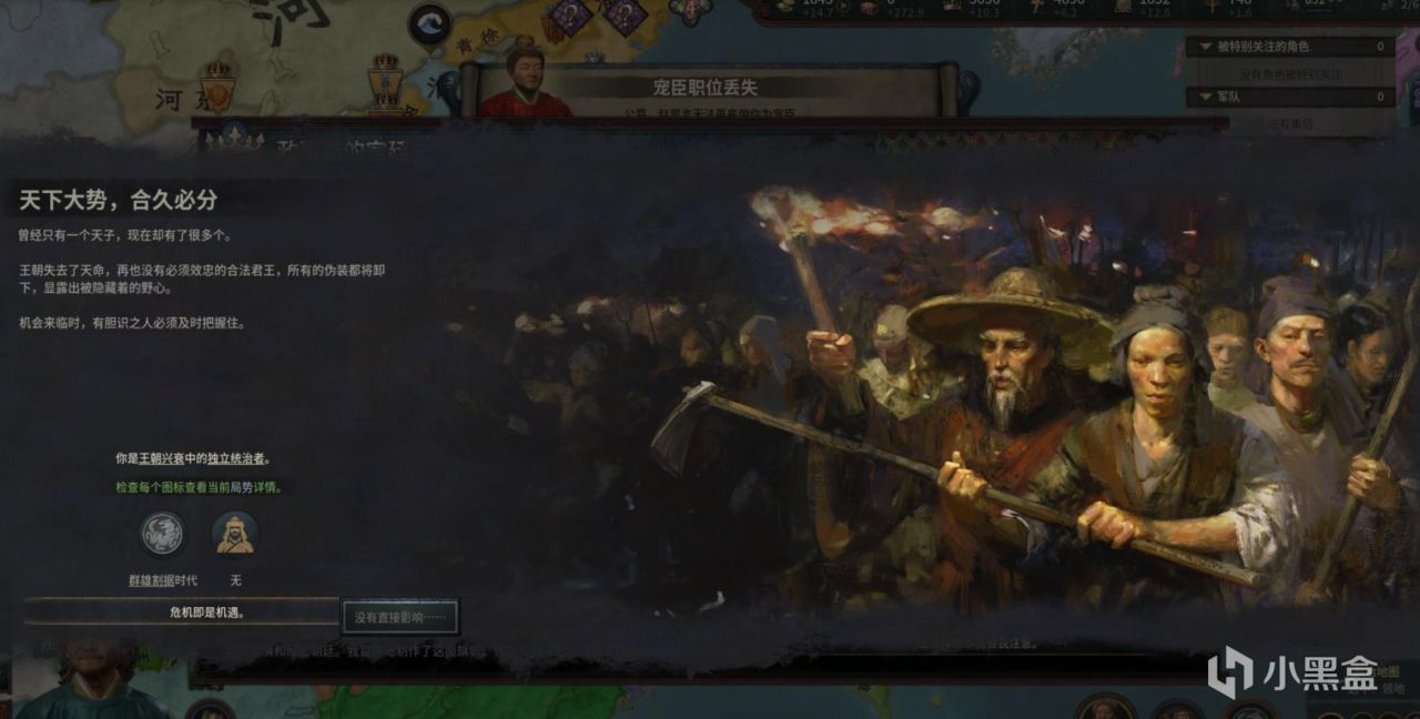 “王朝兴衰的天运系统”是DLC《溥天之下》里我们大天朝独有的游戏机制,简单点说就是不同的朝代有不同的王朝气运。主要分为开疆扩土、政通人和、局势紧张和群雄割据四个时代,不同的时代的各种加成和减益效果会直接左右我们家族的发展方向。