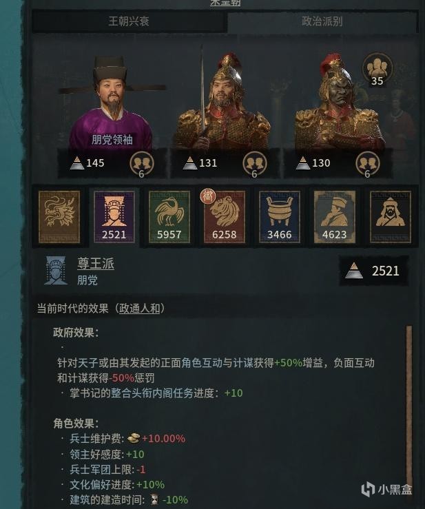 比如在“开疆扩土”这个武德比较充沛的时代,某些派系能够得到军费减免,这时候走武将路线就能获得更大的优势;而在“政通人和”时代,王朝局势稳定,某些党派能获得建造增益,这就妥妥该选择文官体系的种田党了。