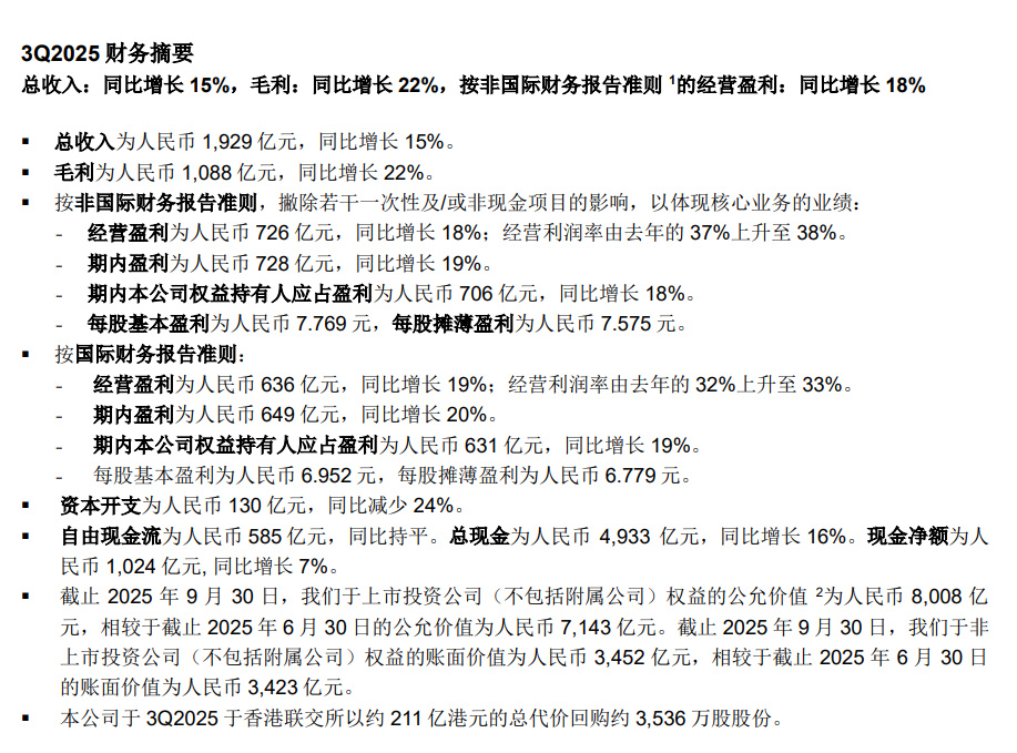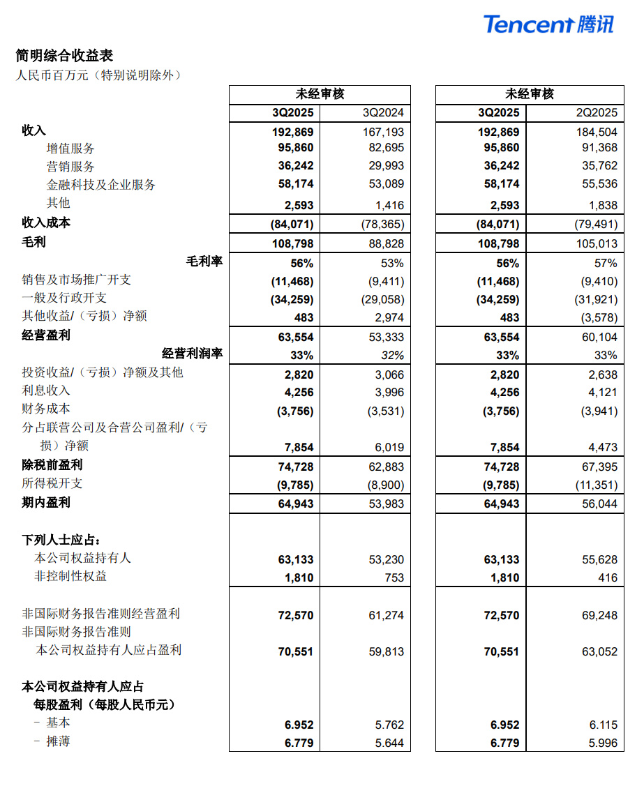 腾讯今日公开了2025年第三季度的财报,本季度总收入1928.69亿元,同比增长15%;经营盈利635.54亿元,同比增长19%。