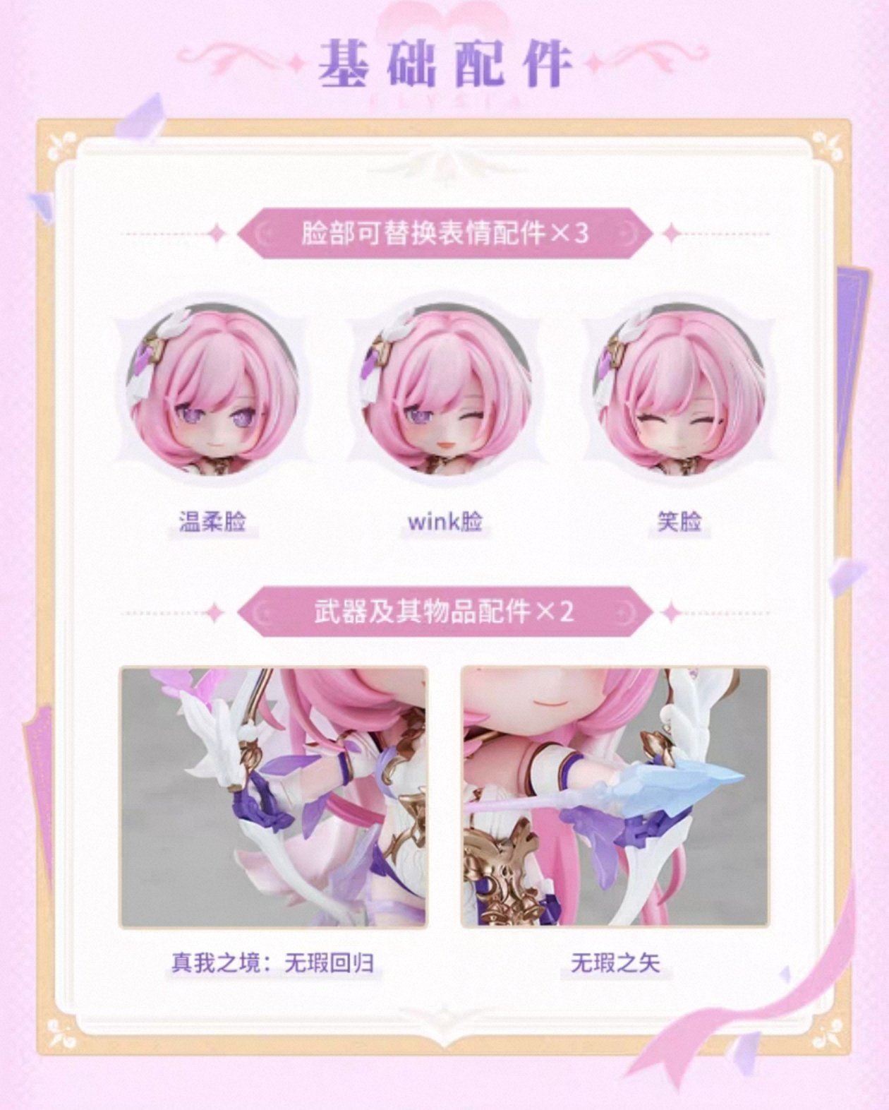 本次推出的「黏土人 愛莉希雅 真我·人の律者」,將附帶「溫柔臉」「笑臉」「眨眼臉」三種表情配件,還搭配「真我之境:無瑕迴歸」「無瑕之矢」等可選配件,助力你還原愛莉希雅的多樣帥氣姿態~