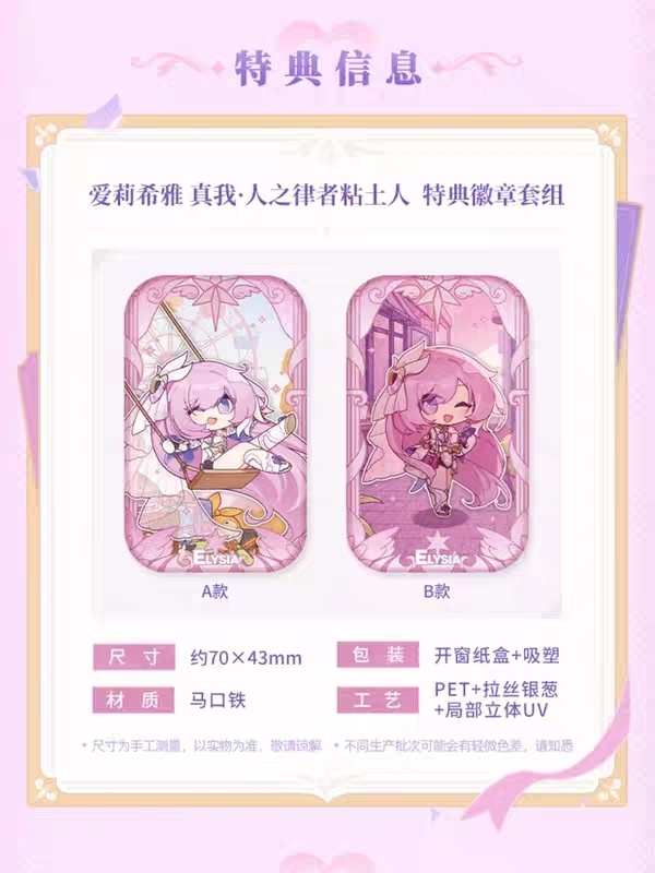 該黏土人可通過米遊鋪,miHoYo官方旗艦店購買購買,將附贈特典「徽章A+B套裝」——這是一套印有愛莉希雅可愛形象的徽章,想要獲取該特典的話,記得選擇指定店鋪購買哦~