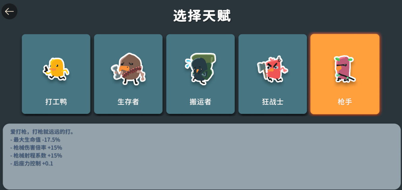 目前遊戲一共設置了五個天賦,其中打工鴨是開局就有,另外四個需要完成任務解鎖。遊戲CH還是很大方,二週目天賦是可以直接繼承的,你可以直接選擇喜歡的天賦玩法去挑戰更高難度。