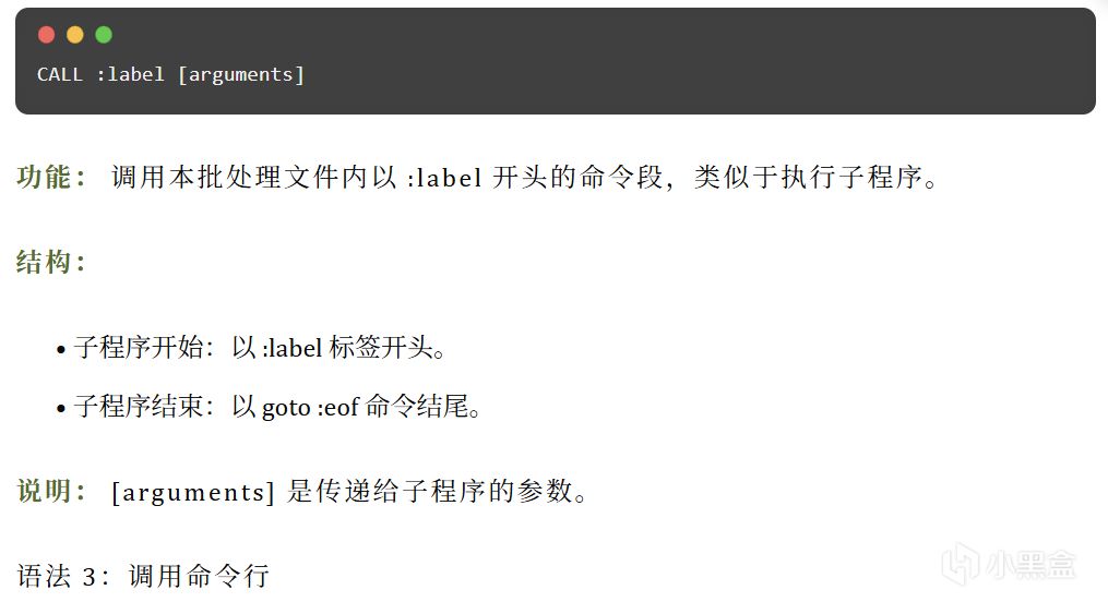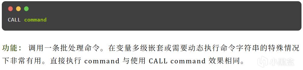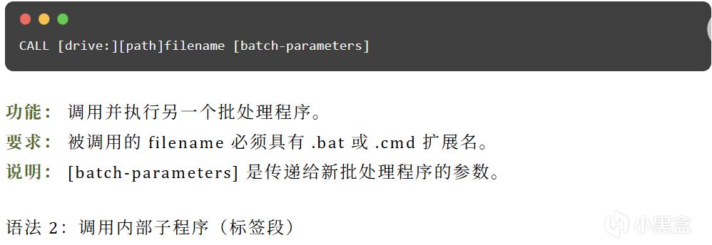 CALL 命令主要用于在批处理执行过程中调用另一个批处理脚本或本脚本内的子程序。调用完成后,会继续执行原批处理中后续的命令。