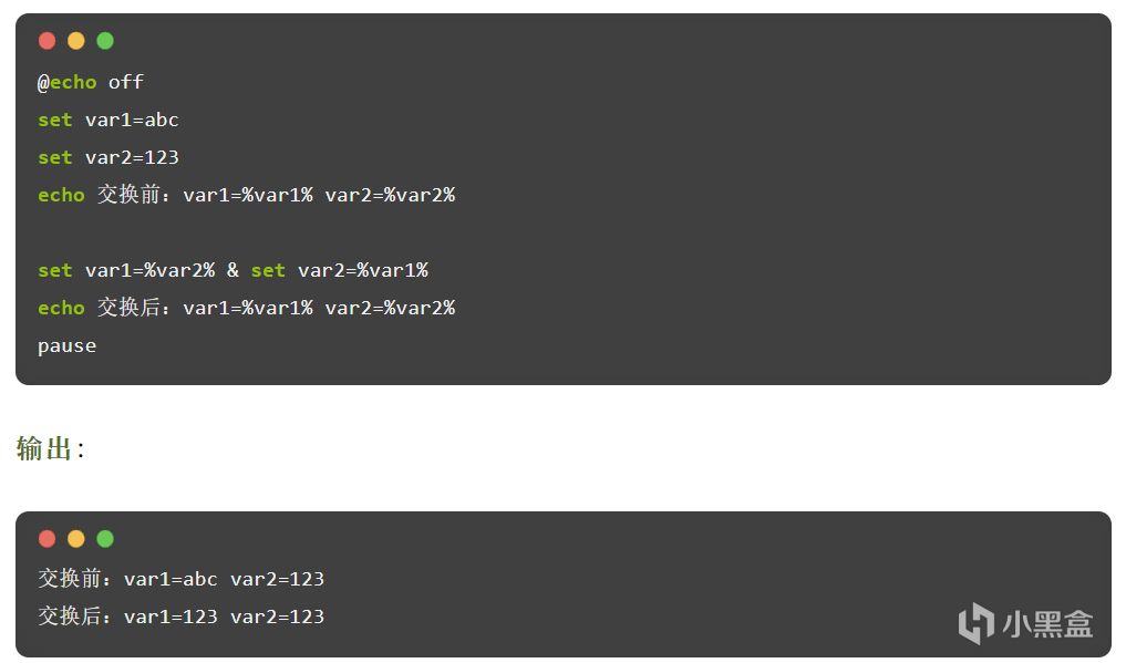 说明:由于预处理,set var2=%var1% 中的 %var1% 仍是原值"abc",因此交换失败。