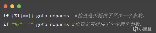 goto noparms - 如果条件为真(即第一个参数为空),则跳转到脚本中名为 :noparms 的标签段执行。通常,:noparms 部分会显示一条错误信息,告诉用户如何使用脚本,然后退出。