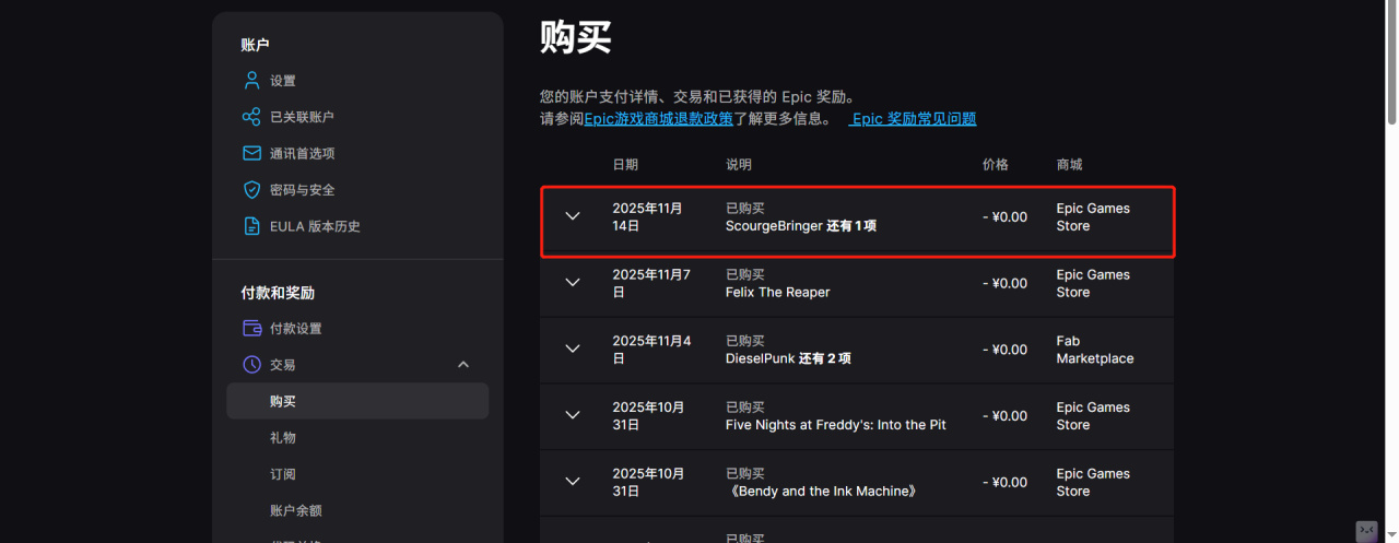 4.若不放心是否领取成功可以进入E宝账户的“交易”页查看:Epic购买记录页