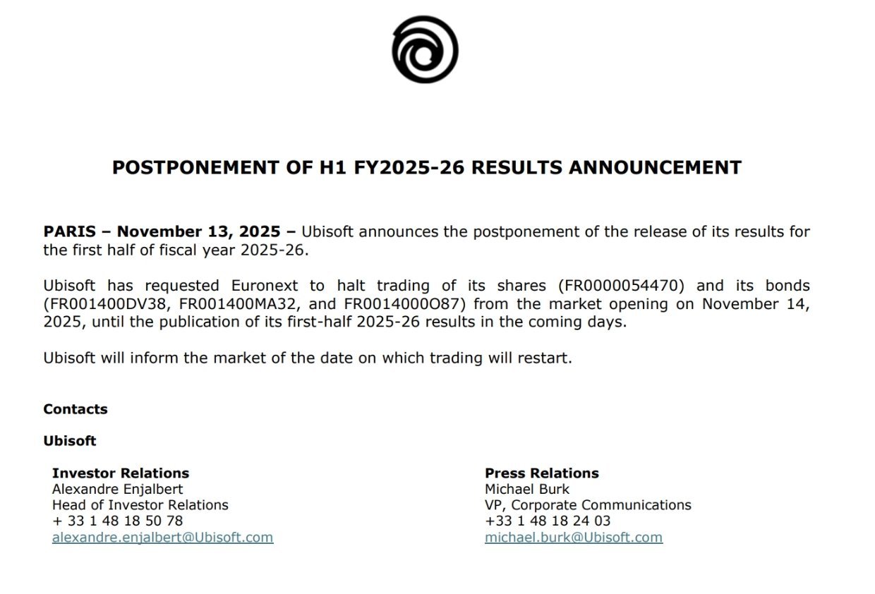 育碧今日宣布,推迟发布公司25-26财年上半年的业绩报告。