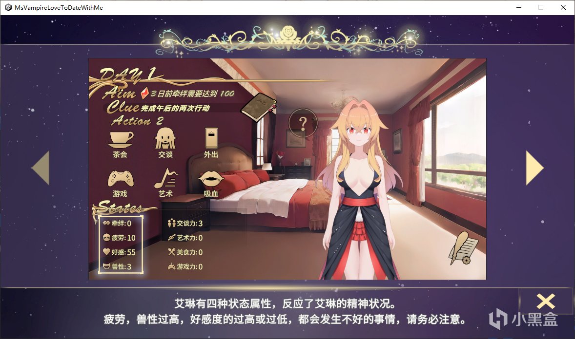 此時數值或許會有壓力,但我們可以通過交談力控制獸性,如果疲勞充裕可以直接購買道具提升遊戲力,反之則通過遊戲的1級行動,亦或吸血來降低疲勞,直到遊戲也達到50點以上時,艾琳將在中期連續進入交談力與遊戲力的中高級約會,你只需要在控制數值的情況下將這兩項數值提升到120到150,便可以輕易達到牽絆值的需求條件。