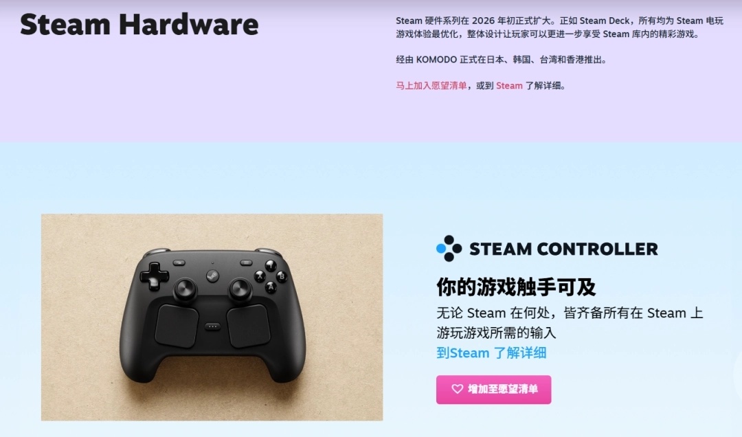 Valve今日正式宣布推出三款Steam品牌硬件产品:Steam Machine游戏主机、Steam Frame VR头显和Steam Controller手柄,全部计划于2026年初上市。目前这三款产品的Steam商店页面均已上线,详细展示了各项参数功能。