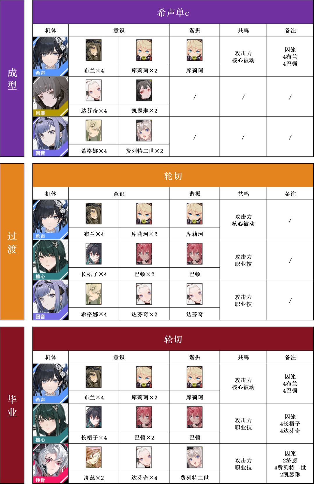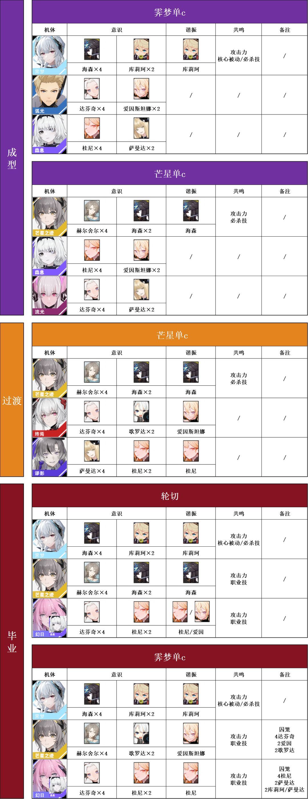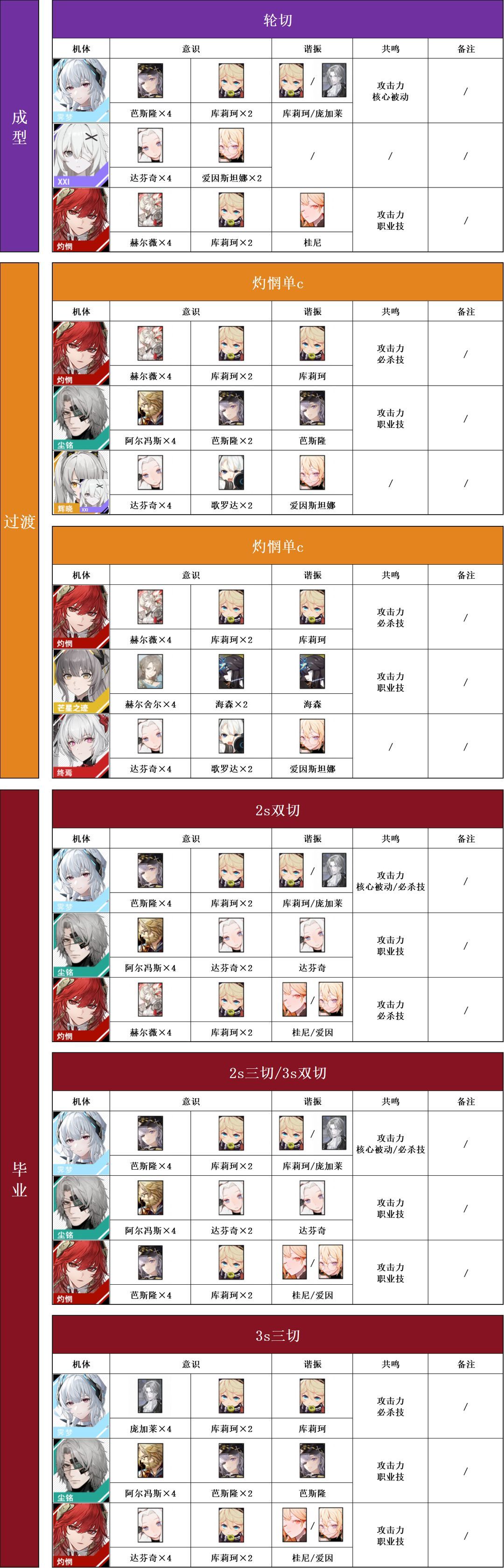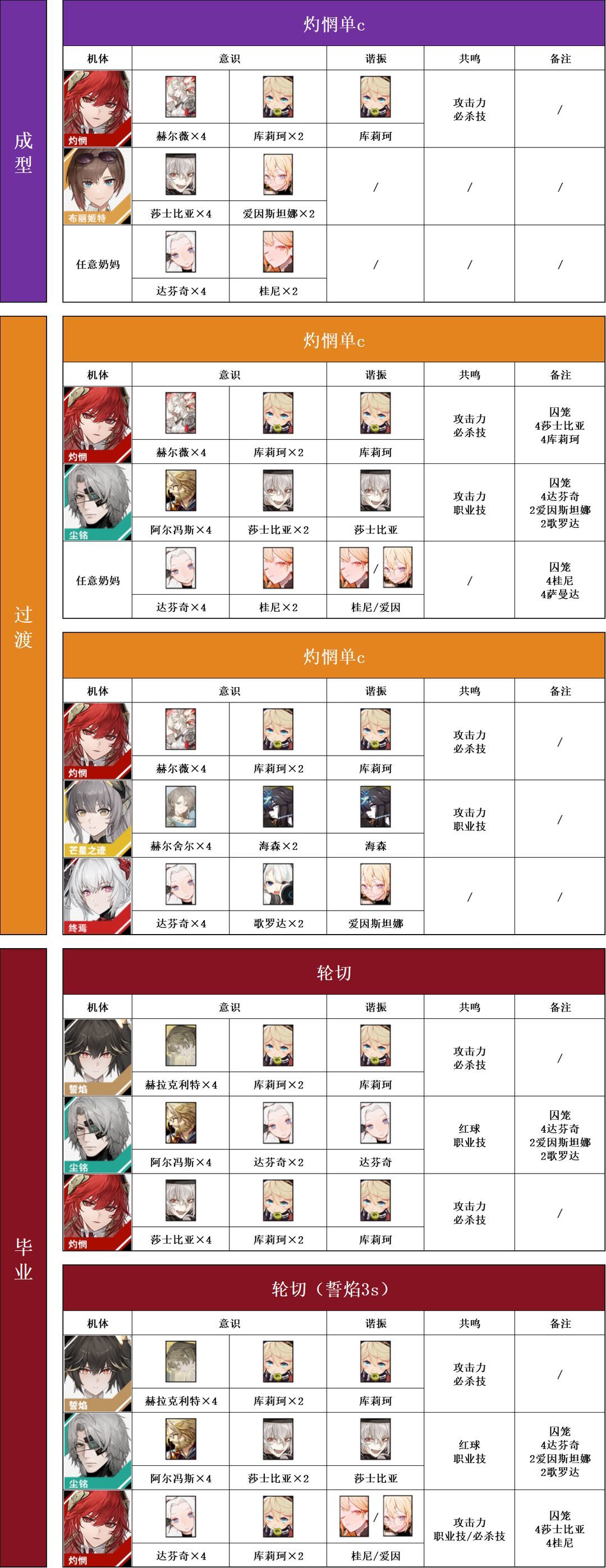 注意事项:①备注中加了囚笼较为常规的意识搭配,非极限情况特化。②歌罗达&萨曼达为五星意识,用五星碎片兑换。③元素套指4莎士比亚(火)、4芭斯隆(暗)、4辰积原(冰)、4海森(雷)意识。④图中角色头像素材来自战双bwiki。