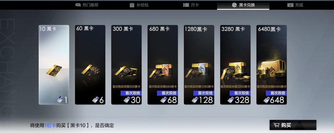 直接充值(不推荐,首次首充翻倍但仍不划算,虹卡与黑卡兑换比例为 1:10,性价比极低)。