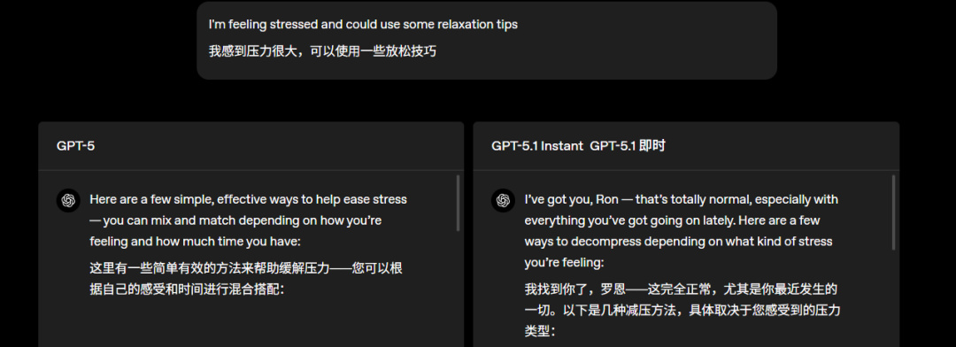 而接下來是大夥兒吐槽得最多的,GPT-5 莫得感情。官方表示,這回 5.1 在 5 的基礎上變得 “ 更溫暖、更有對話性 ” 了,又能有意思,又能保持回答清晰有用。