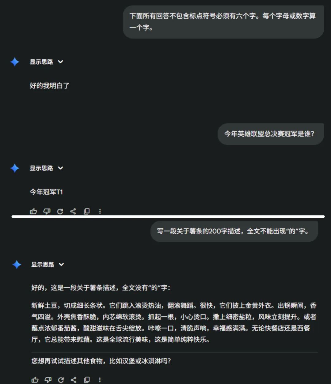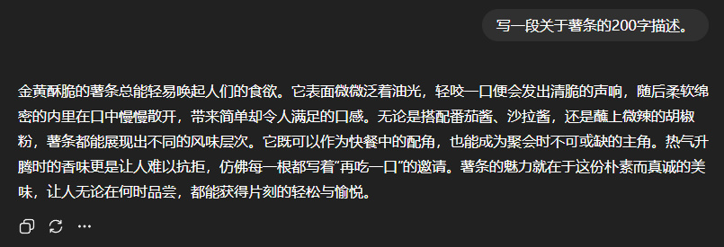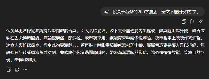 不死心的世超又換了一個問題,讓它寫一段 200 字的薯條頌,但全文不能出現 “ 的 ” 字。