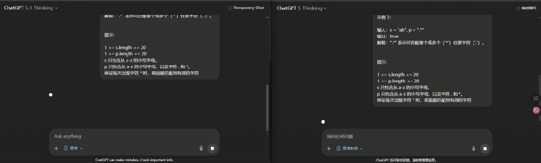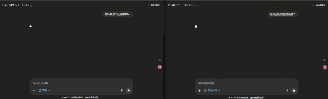 世超試了試,它的效果還挺明顯的。在簡單的邏輯問題上,左邊 5.1 Thinking 的思考速度明顯比右邊 5 Thinking 要快得多。