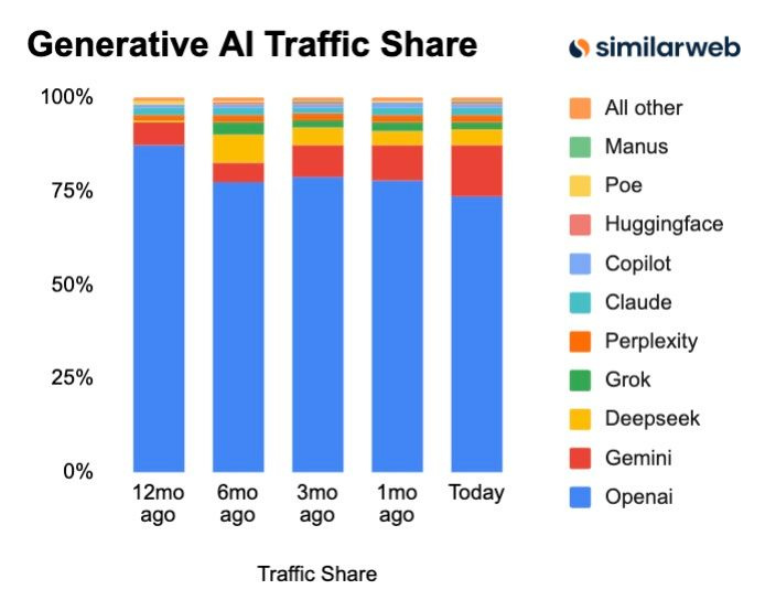根據 10 月的一篇報告,GPT 在 2025 已經快走了一年的下坡路,市場份額一直在萎縮。雖然搶佔先機保住了龍頭地位,但 AI 界的競爭依然在殘酷進行中。