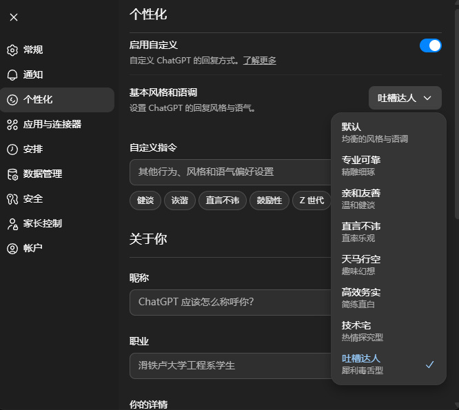 除了上面這些屬於 5.1 的版本變動,ChatGPT 還有個整體大更 —— 在個性化裏面可以設置 GPT 的回答風格,除了默認一共七種人設可選。