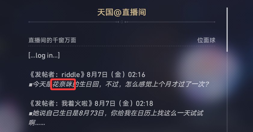 在天國直播間的文本介紹中,我們可以發現一位名字爲花奈咪的主播。花奈咪這個名字,乃是日語中花火的直譯Hanabi,再結合之前花火的PV(百變身份)來看,花奈咪這個稱呼,大概率就是花火的另外一個名字了,也就是另外一個(主播)形態了。