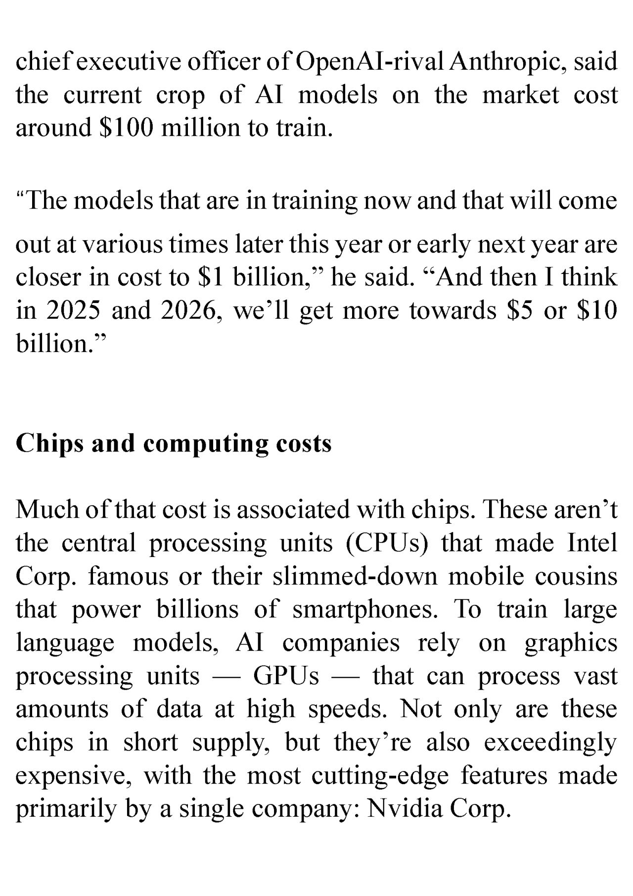 這些成本很大一部分與芯片相關。這些不是讓英特爾公司(Intel Corp.)成名的中央處理器(CPUs),也不是驅動着數十億智能手機的、它們精簡版的移動“表親”。爲了訓練大型語言模型,AI公司依賴圖形處理單元(GPUs)——它們能夠高速處理海量數據。這些芯片不僅供應短缺,而且極其昂貴,其最尖端的產品主要由一家公司製造:英偉達公司(Nvidia Corp.)。